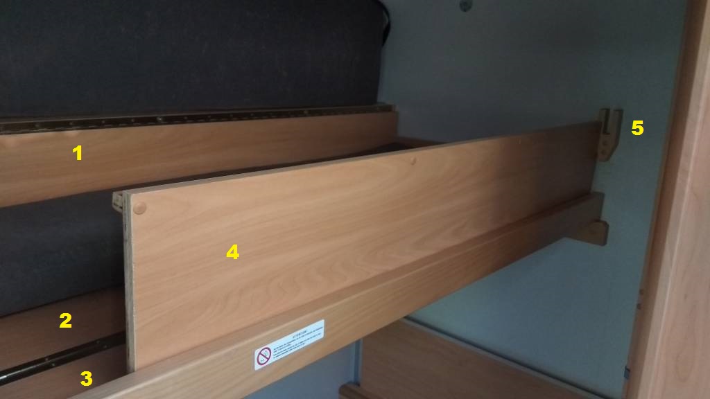 Decha 1 i 2 są ze sobą podłączone na sztywno pod kątem prostym. Cześć 1 na fotce stanowiąca bok łóżka, po złożeniu jest dnem tej niby szafki. Cześć 3 i 4 składa się do środka i po złożeniu ich nie widać. Decha 4 to moja inwencja, bo wcześniej była długa na całą szerokość przyczepy i była wkładana w uchwyty 5 na ścianie, co skutecznie uniemożliwiało wyjście dzieciaka z wyra. Odciąłem 1/3 mniej więcej i przykręciłem na zawiasach do nr 3. Barierkę klinuje się materacami i jest git.