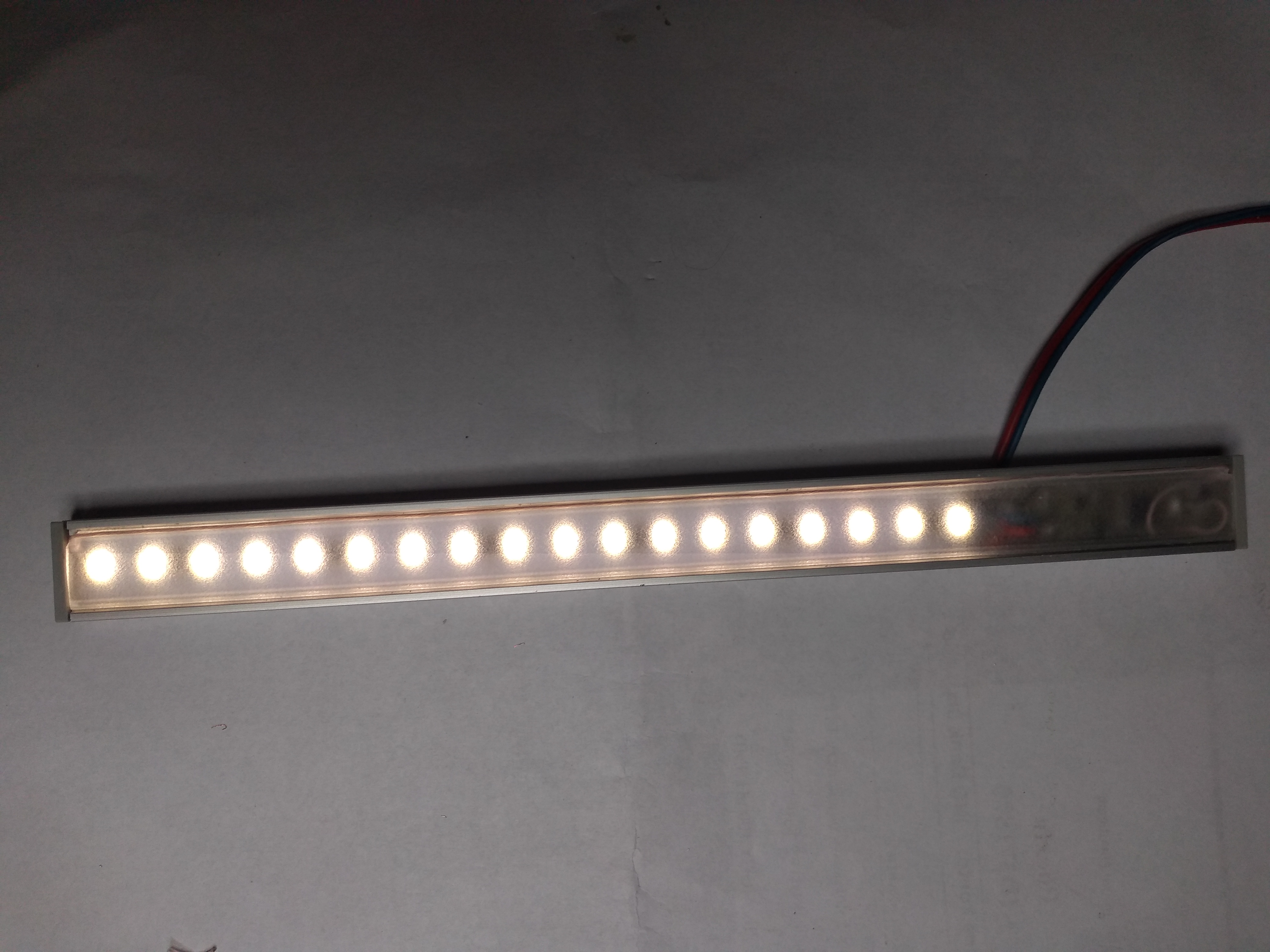 Taśma led wykorzystana do lampy to taśma na sztywnym, aluminiowym podkładzie zawierająca 120 diod typu 2835 na 1 m, o strumieniu świetlnym 2100 lm/1 m i pobieranej mocy 20 W/1 m. W lampie zastosowałem odcinek taśmy z 18 diodami. Diody te wydzielają dość dużo ciepła, dlatego konieczne jest przyklejenie aluminiowego podłoża do profilu klejem termoprzewodzącym, aby profil mógł służyć jako radiator odprowadzający ciepło.