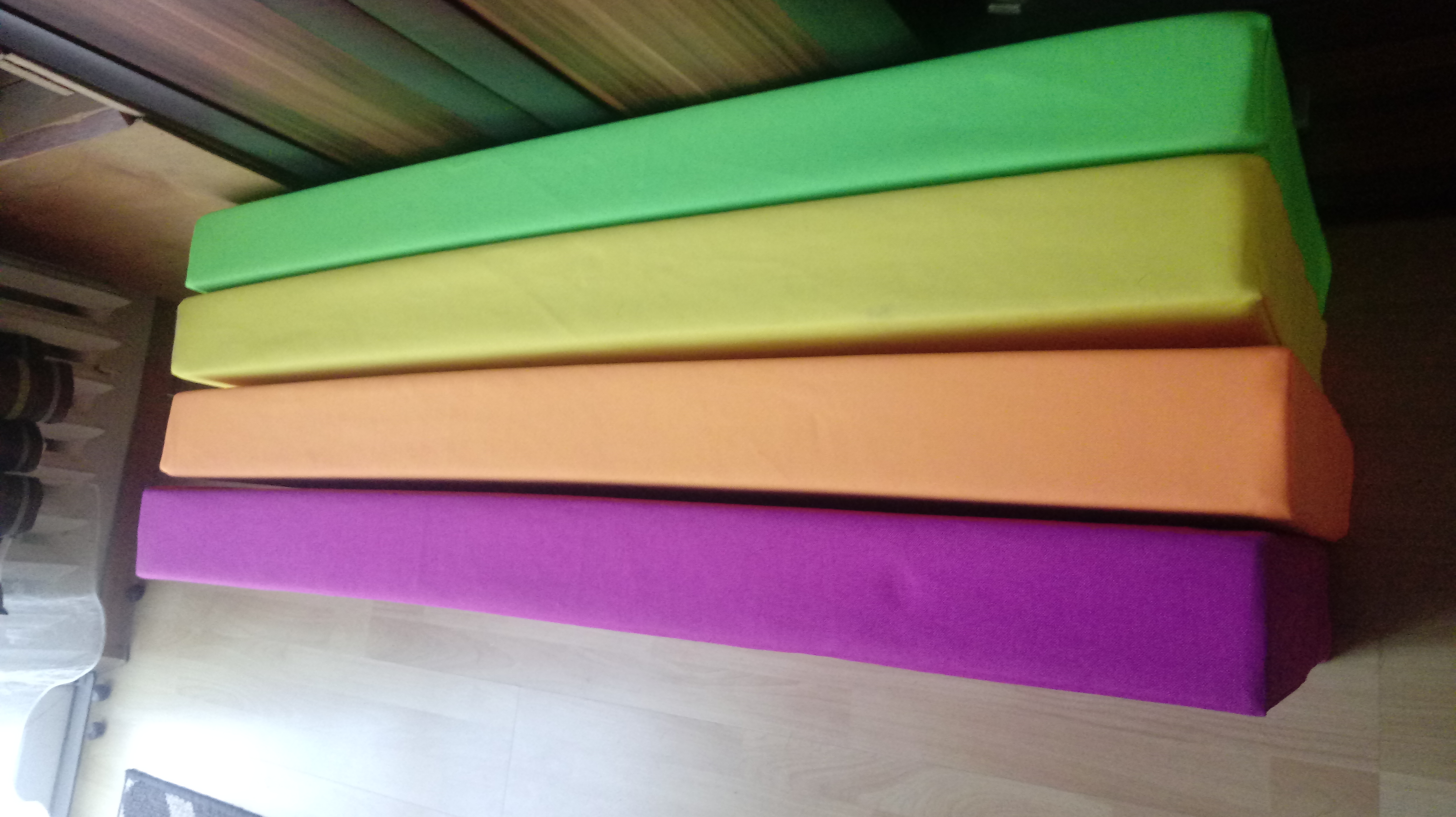 Kupiliśmy w końcu nowe gąbki na materace. Twardość T30. Dodatkowo nowe materiały na obicie. Żeby było ciekawiej, każdy materac będzie w innym kolorze. Taka nasza fanaberia.