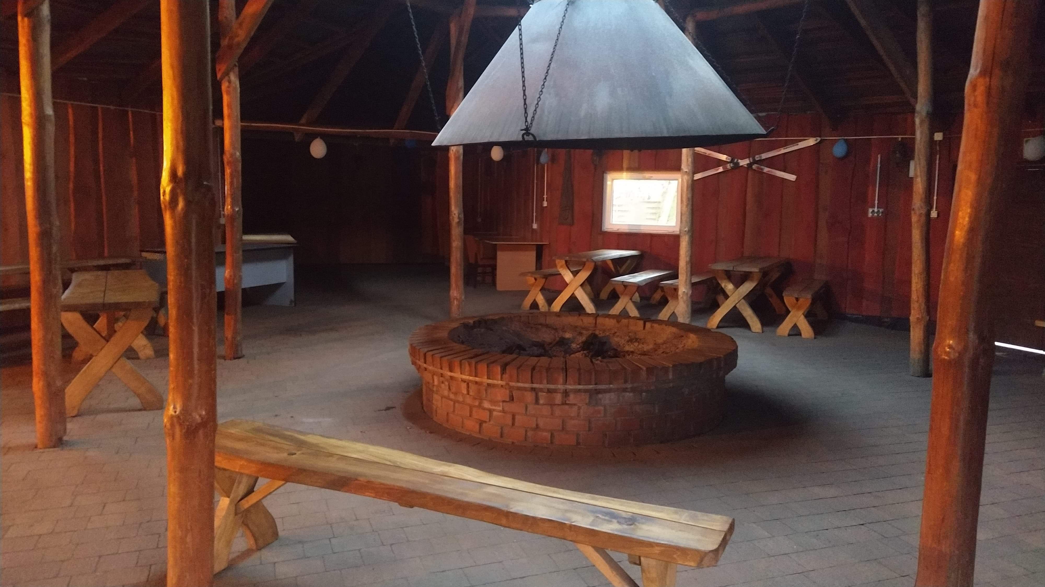 Wnętrze dymnej chaty z ogniskiem