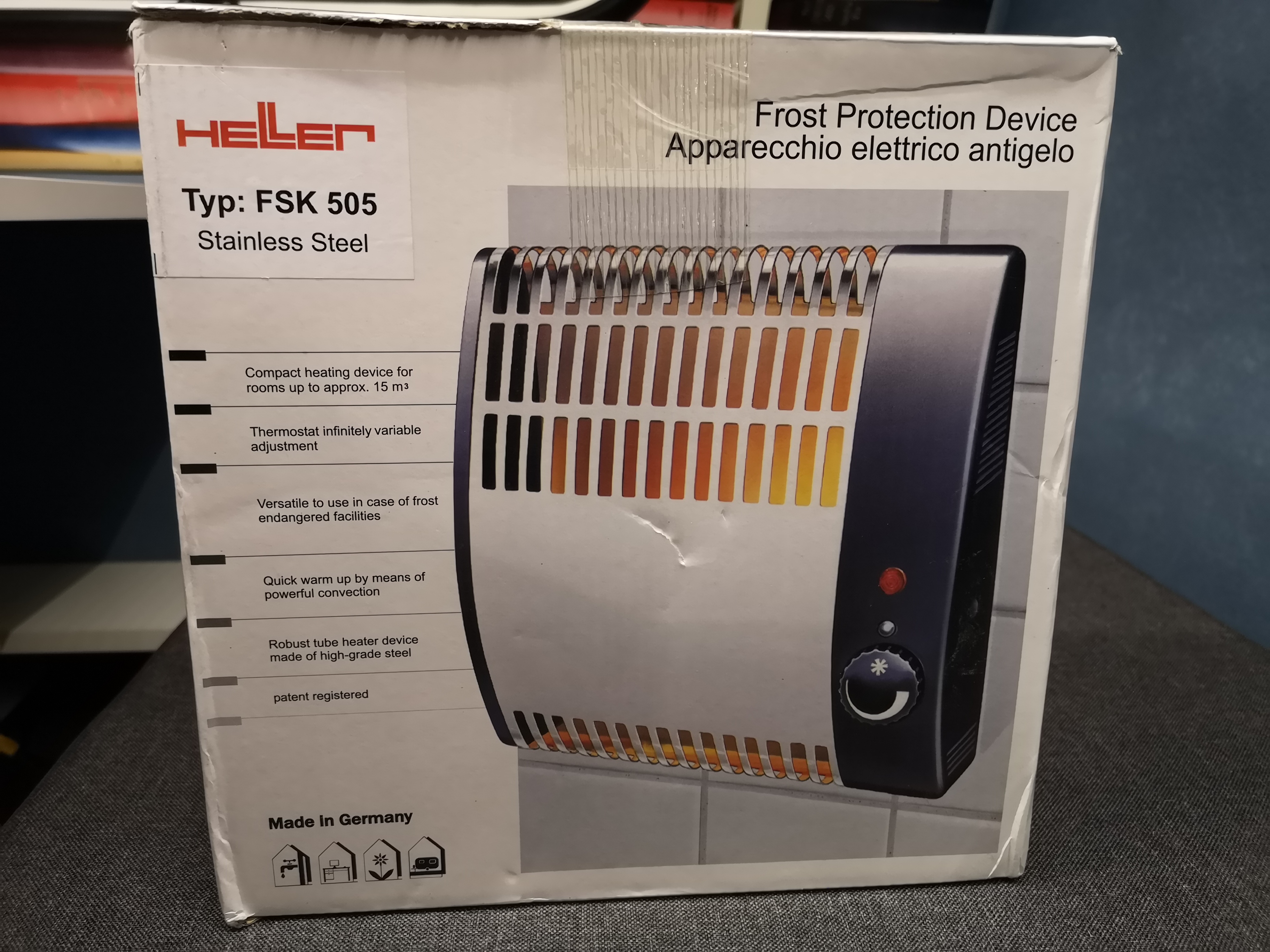 Druga sprawa to ogrzewanie. Chciałem kupić coś małego, bezgłośnego na 230V. Sporo aukcji przejrzałem i napotkałem grzejnik niemieckiej firmy Heller model FSK 505 - 500W za 79zł. Jedna z zalet to bardzo małe rozmiary 24x24cm i grubość 4-7cm (poza tym modelem wszystkie inne grzejniki na aukcjach mają wymiary od ok 40x40cm). Grzejnik ten według producenta służy do utrzymywania stałej temperatury w pomieszczeniach ( w tym przyczep kempingowych - jest nawet oznaczenie na opakowaniu) do 15m2 w zakresie od 5st do 16st (zależy jaką temperature się nastawi). Zrobiłem mały test przy temperaturze na zewnątrz 4st po włączeniu grzejnika i upływie 90min w Niewiadówce temperatura wzrosła do 22st po kolejnych 90min temperatura nadal wynosiła 22st i wyłączyłem grzejnik. W tym czasie w przyczepie nie przebywałem a termometr był na drugim końcu przyczepy względem grzejnika. Jak ktoś szuka czegoś małego i cichego do grzania to chyba najlepsza opcja.