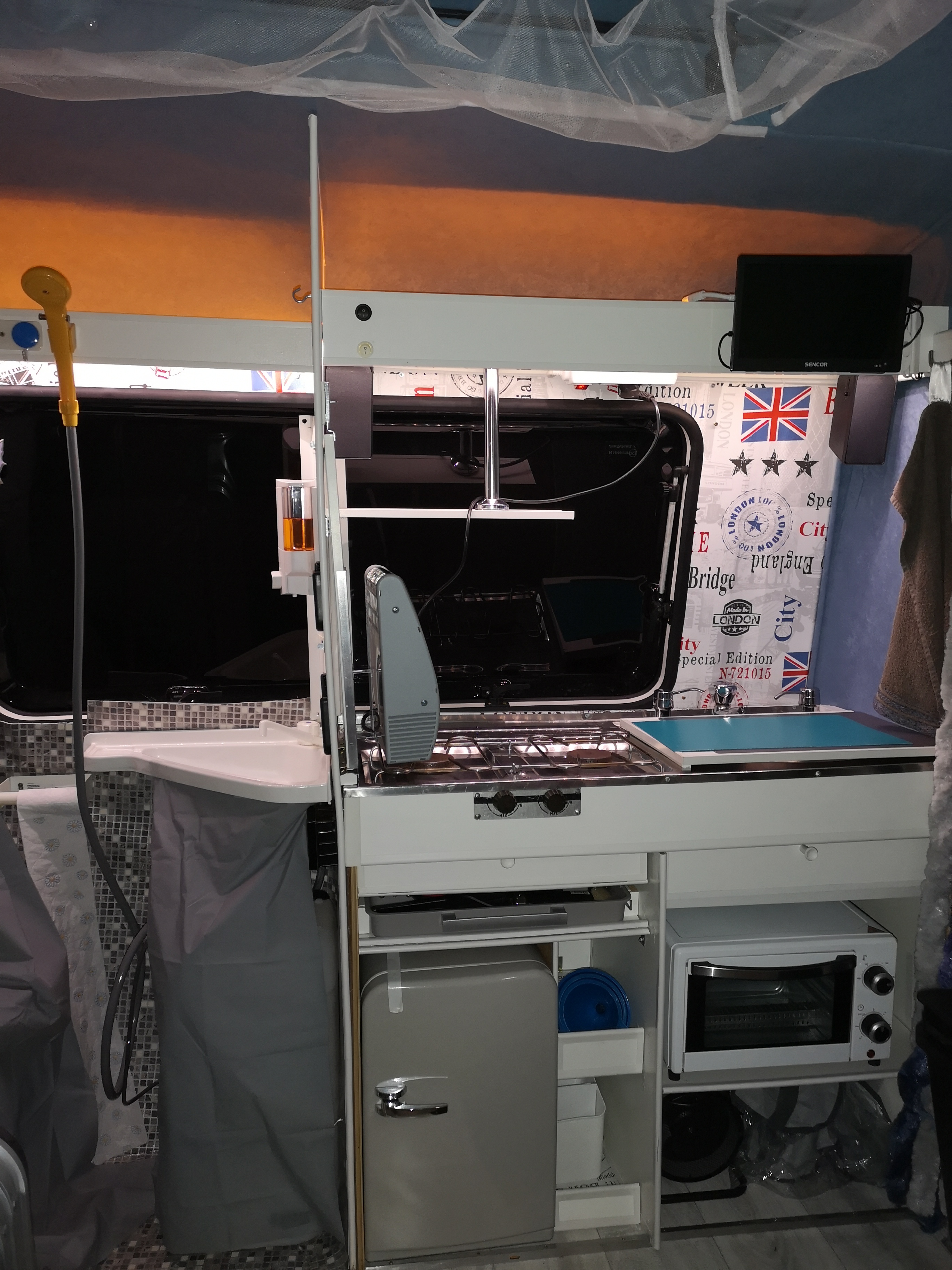 Co do montażu grzejnika to mam już każdy skrawek przyczepy zagospodarowany i nie chciałem żeby mi jakoś przeszkadzał. Dlatego wykorzystałem blat osłaniający kuchenkę . Do blatu przykryciłem na stałe dwie śrubki na które w razie potrzeby można zawiesić grzejnik. Bok grzejnika jest plastikowy i praktycznie w ogóle się nie grzeje także nie ma się jak oparzyć. Efekt końcowy poniżej na fotkach.