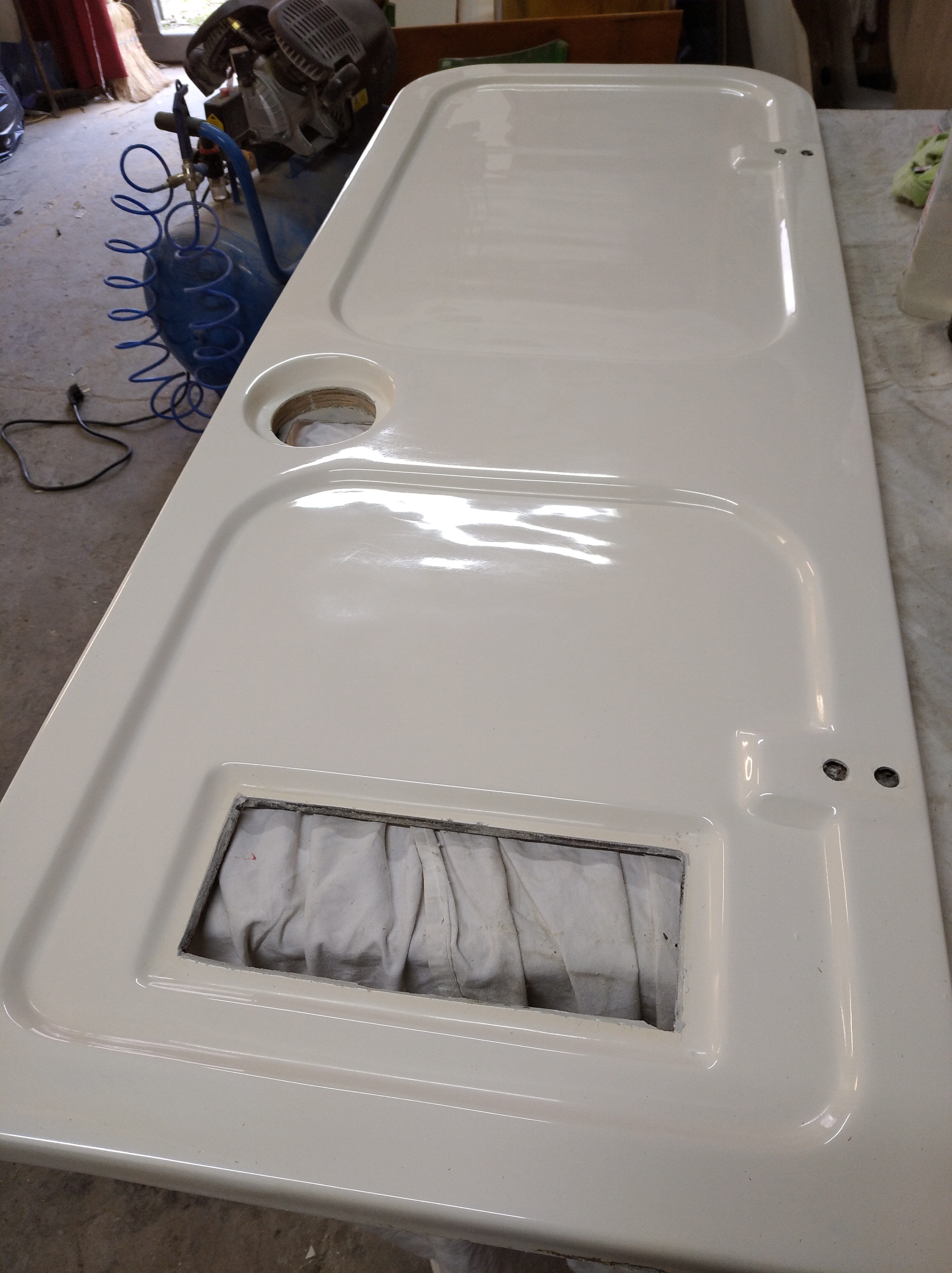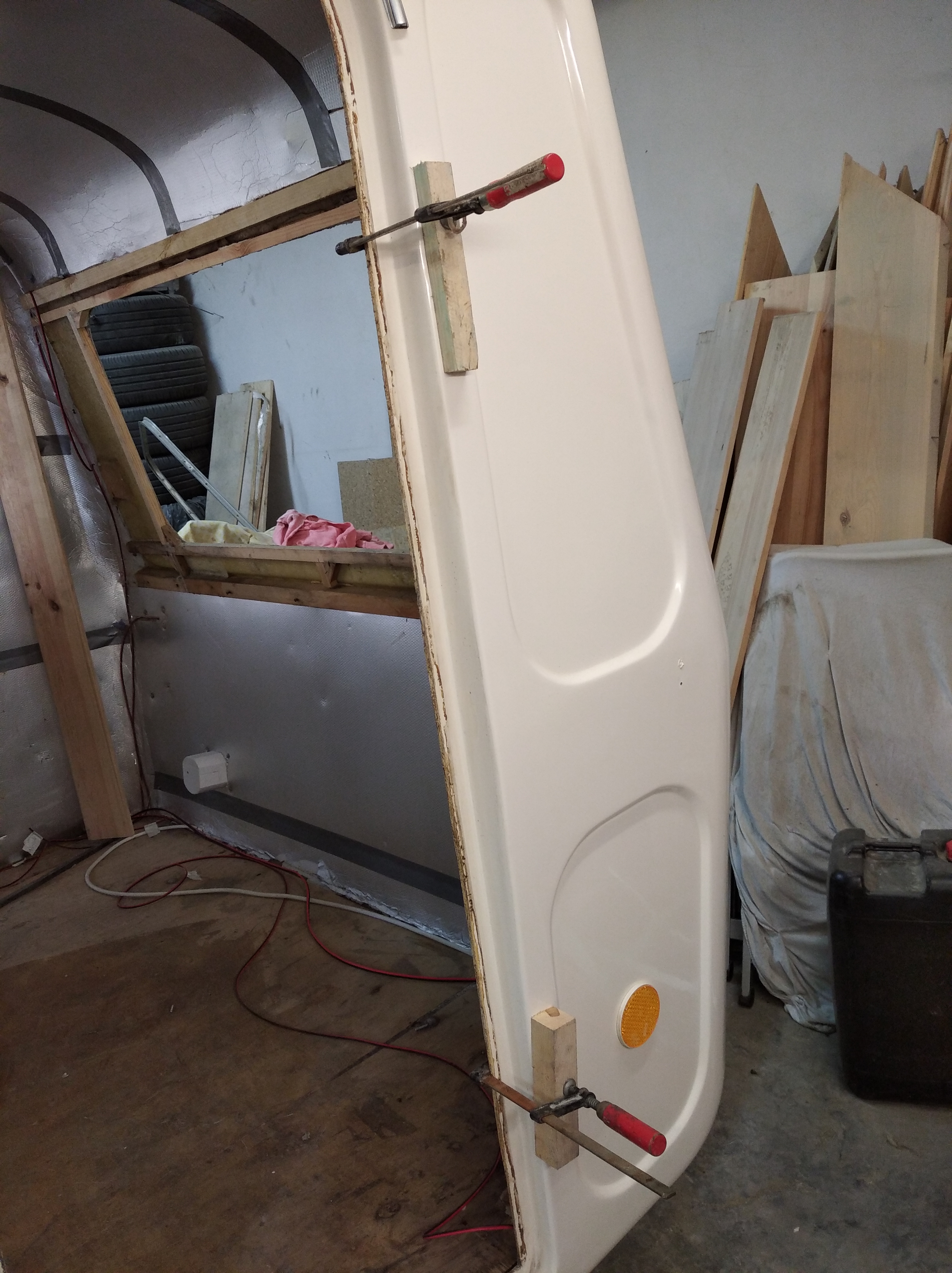 Klocki pod zawiasami drzwi próchno! Wymiana. Montaż lampki oświetlenia przedsionka i laminowanie jednego mocowania pawlacza bo okazał się delikatnie luźny.