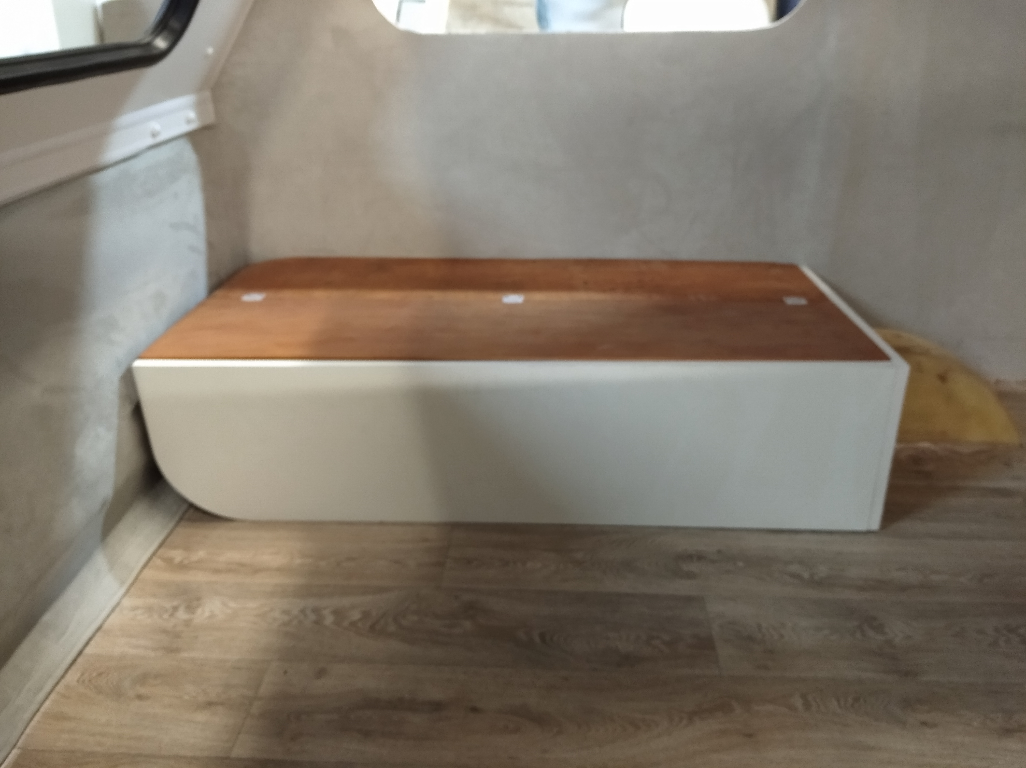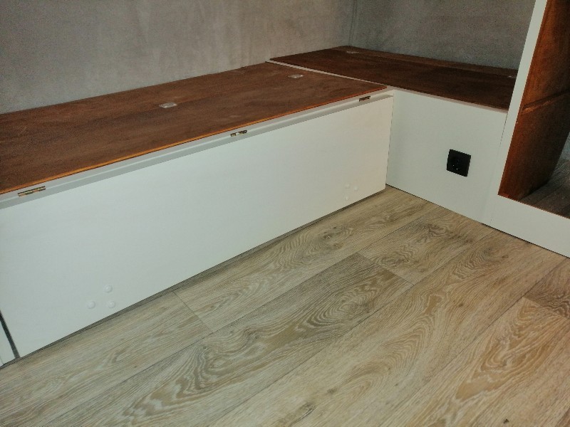 Postanowiliśmy zgłębić temat i zrobiliśmy modyfikację polegającą na zrobieniu tego elementu z dwóch kawałków połączonych (tylko z powodu kąta ściany) listwą meblową typu H stosowaną np w "plecach" szafy. To rozwiązanie okazało się strzałem w 10! Jedynym powodem dlaczego Niewiadów robił to z 5 kawałków jest chyba oszczędność materiału.