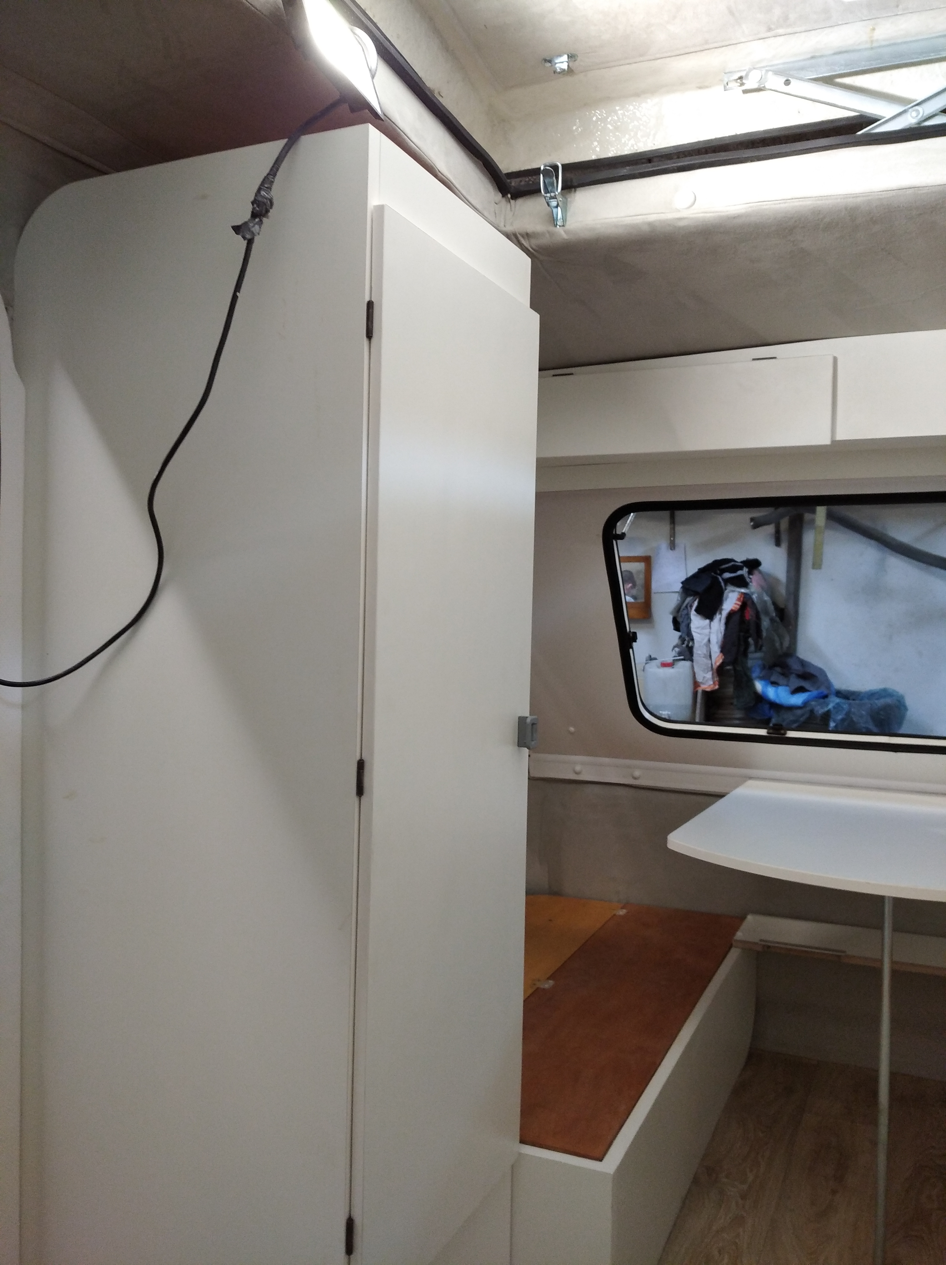 Po zamontowaniu mebli zdecydowałem, że muszę doszyć jeszcze wałki z alcantara aby wypełnić szczelinę pomiędzy pawlaczami a dachem. Taki "patent" stosuje fabryka w nowych przyczepach aby zamaskować peerelowską jakość i spasowanie mebli