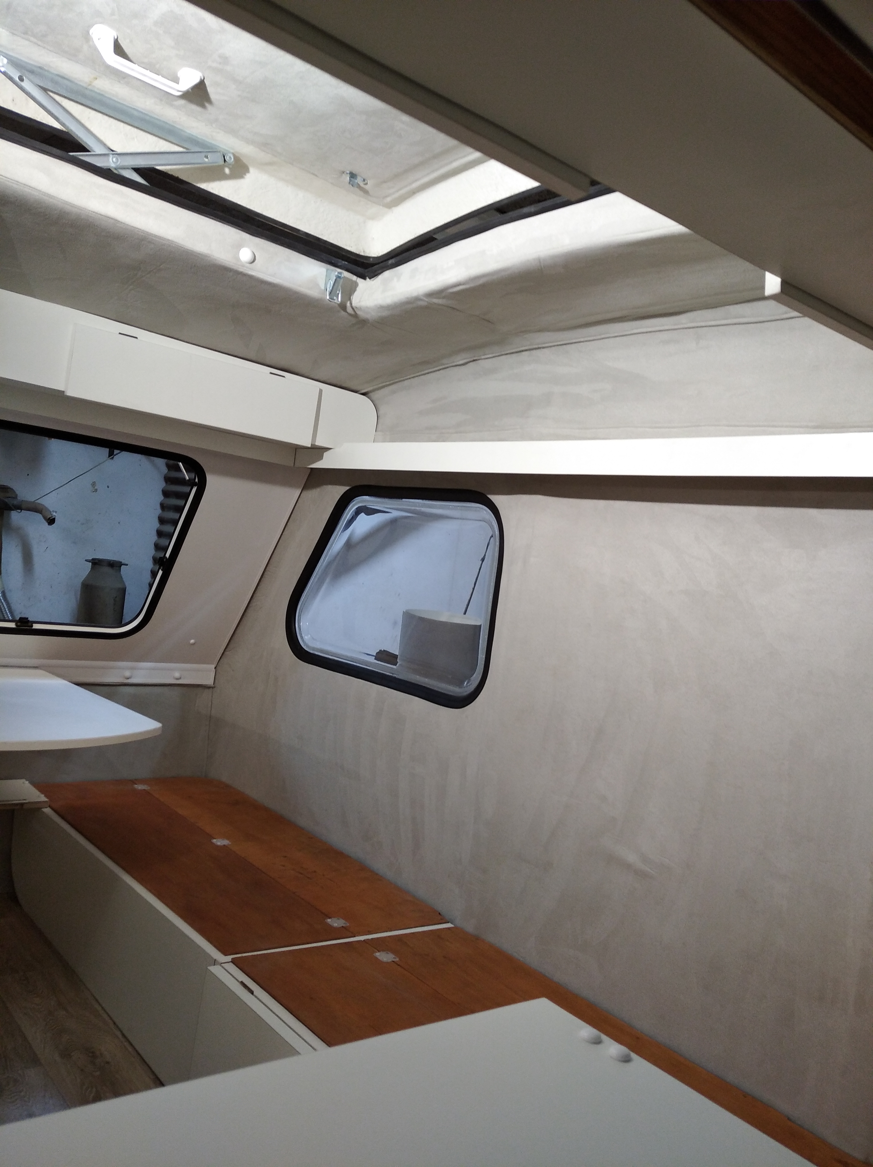 Po zamontowaniu mebli zdecydowałem, że muszę doszyć jeszcze wałki z alcantara aby wypełnić szczelinę pomiędzy pawlaczami a dachem. Taki "patent" stosuje fabryka w nowych przyczepach aby zamaskować peerelowską jakość i spasowanie mebli
