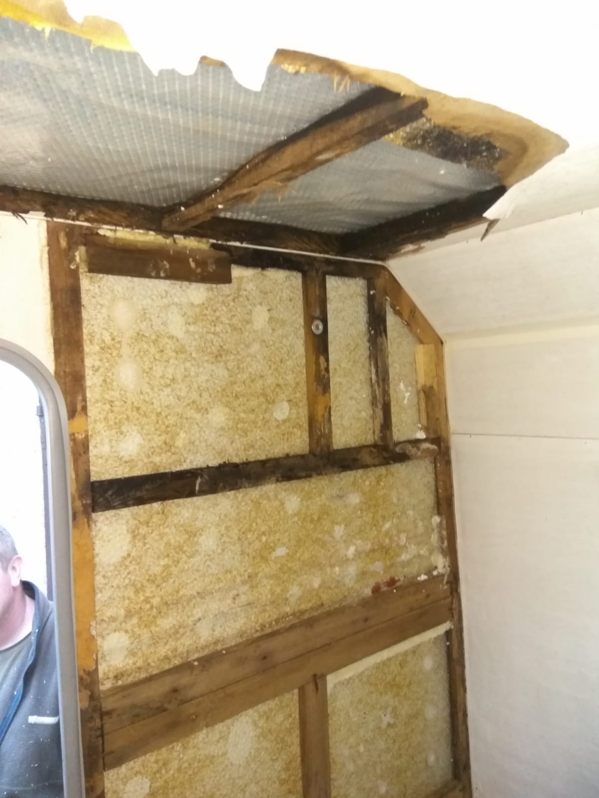 Po rozebraniu... takiee widoki i od razu atak by zdążyć na wyjazd sierpniowy na Węgry. Dokładne zwymiarowanie konstrukcji ścian, suche kantówki, kleje, wkręty, pokrywałem ściany płytą pilśniową. Podłoga na szczęście okazała się nie być zgnita.