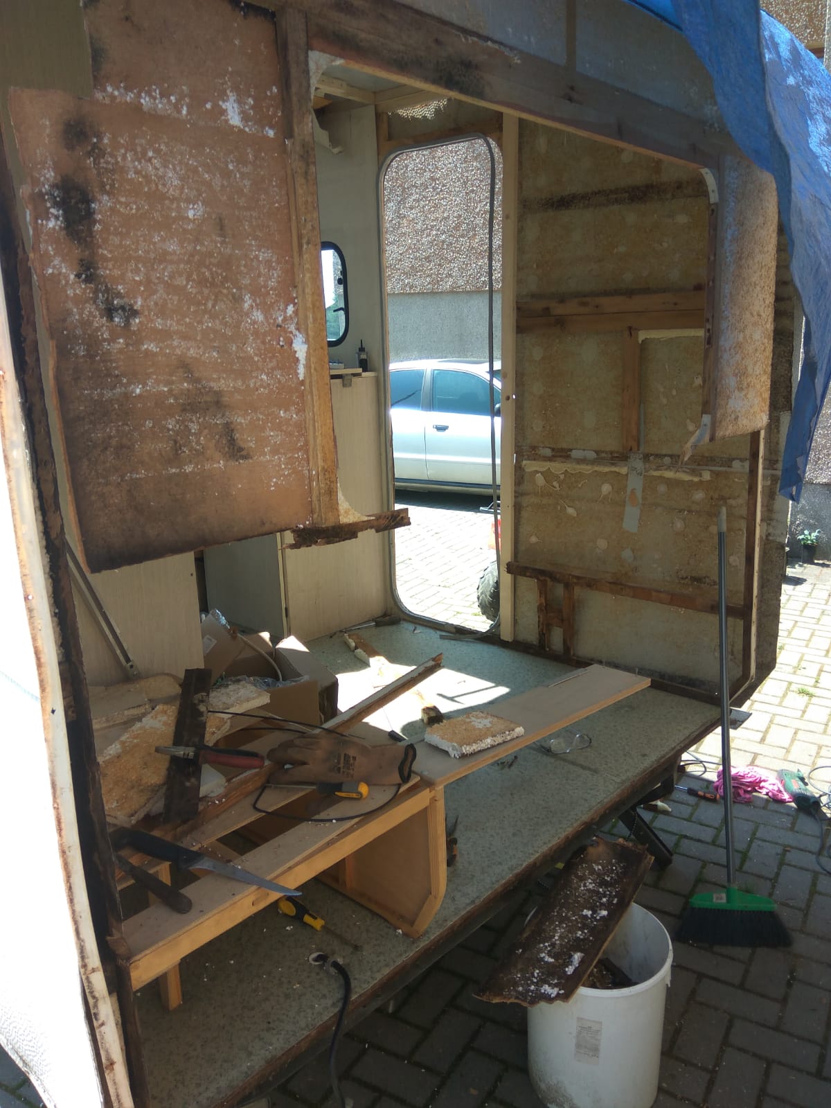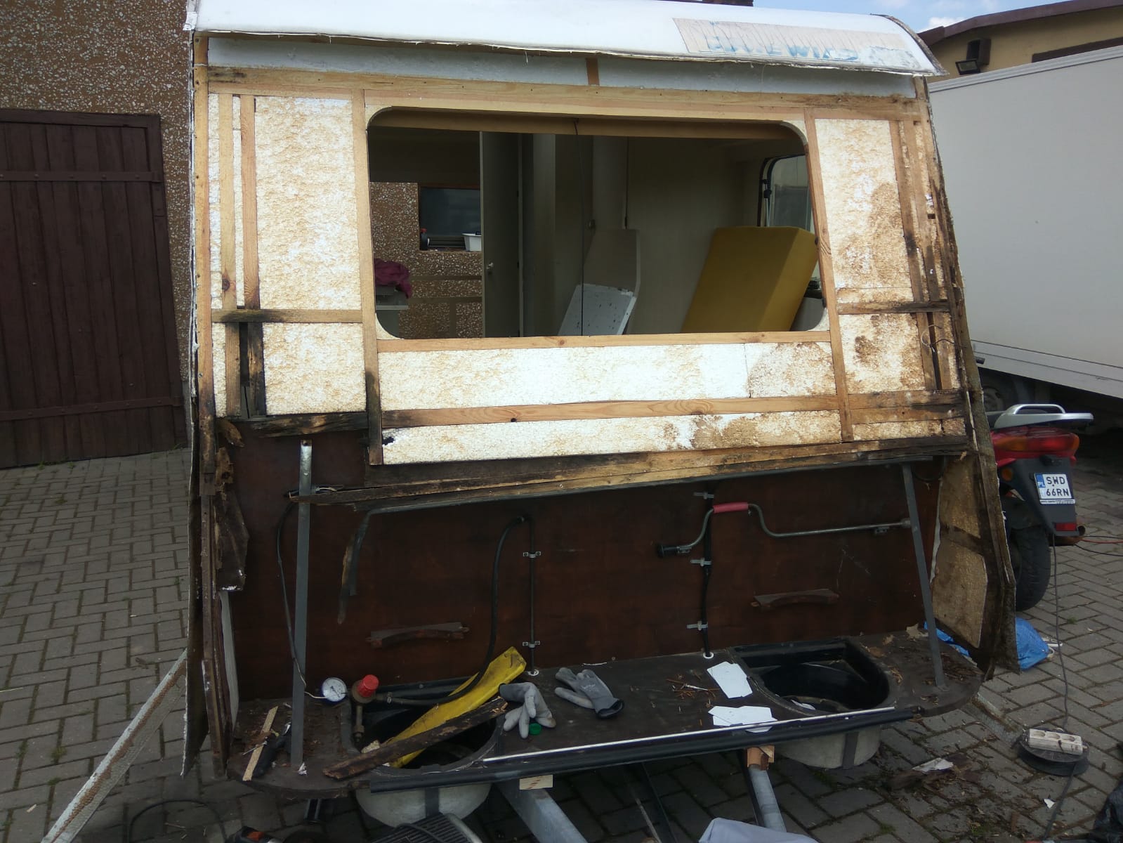 Po rozebraniu... takiee widoki i od razu atak by zdążyć na wyjazd sierpniowy na Węgry. Dokładne zwymiarowanie konstrukcji ścian, suche kantówki, kleje, wkręty, pokrywałem ściany płytą pilśniową. Podłoga na szczęście okazała się nie być zgnita.