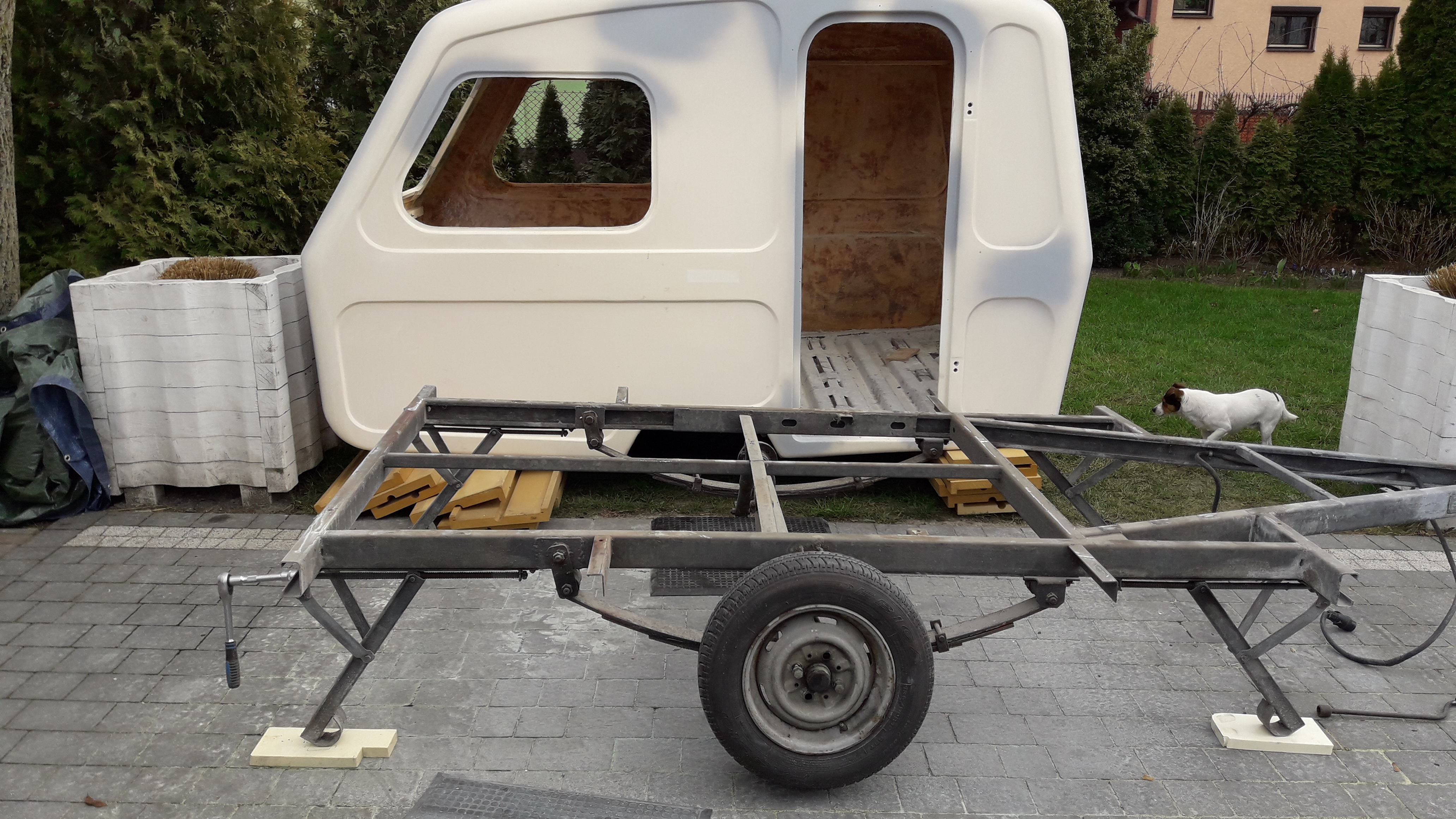 Zdjęcie ukazuje już podniesioną ramę z założonym jednym kołem, mój czteronożny pomocnik dokonał inspekcji
