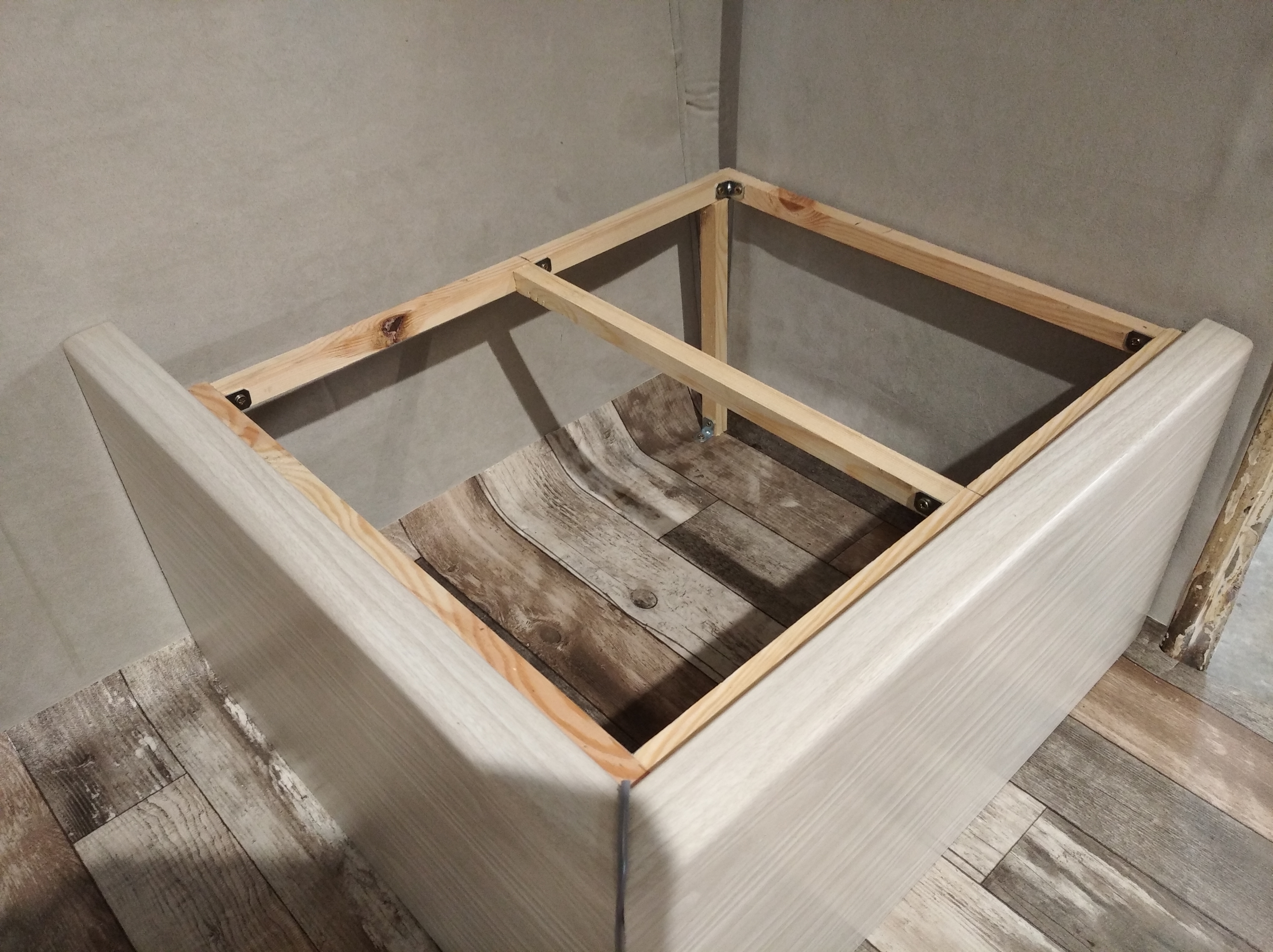 Finalnie tak to będzie wyglądać. Do zamaskowania cięcia (łączenia) narożników użyłem kedry tapicerskiej. Wciśnięta pomiędzy krawędzie skręcone w narożniku idealnie maskuje łączenie.