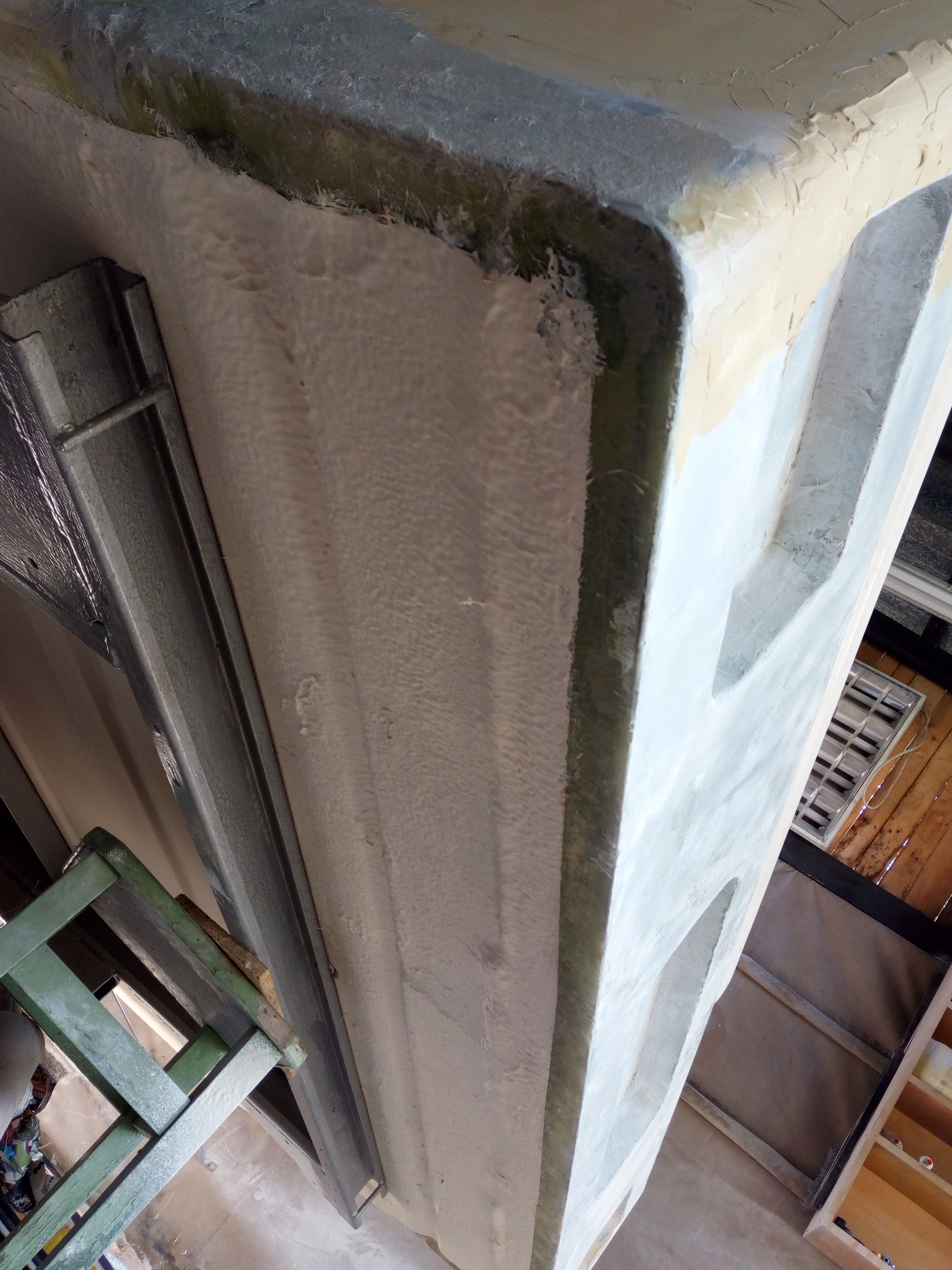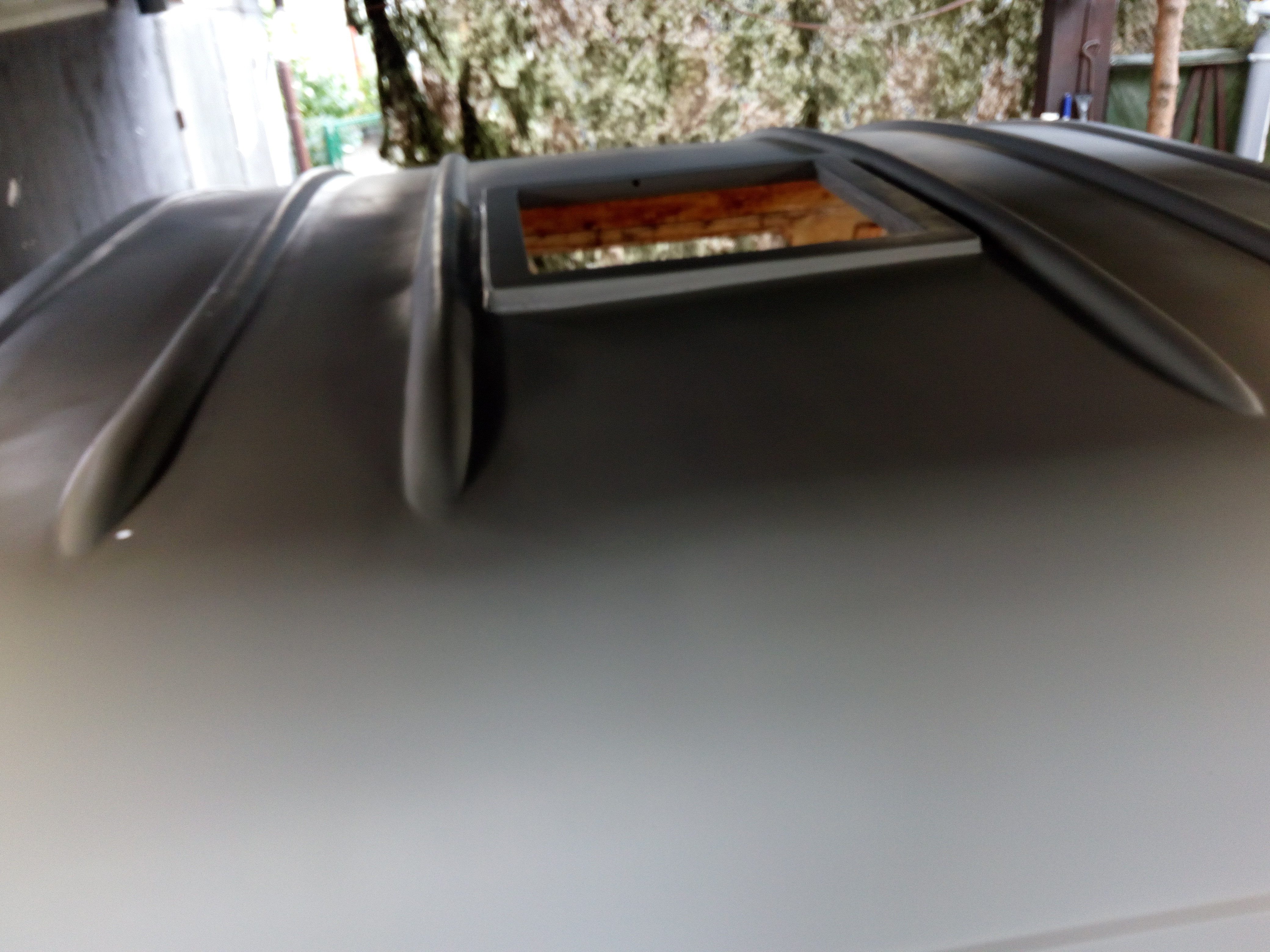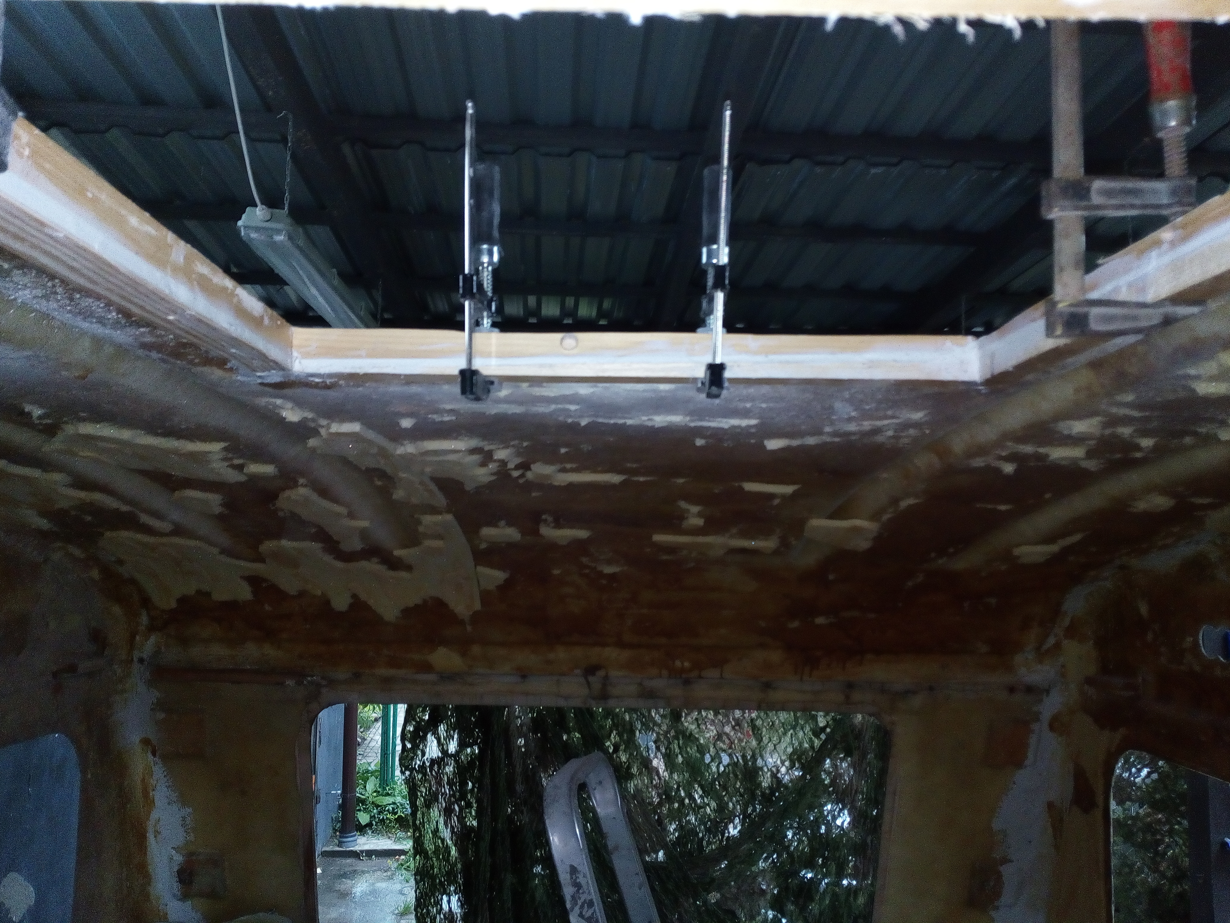 Wlaminowałem 2 x rurki przez które przeciągnę rurki z wodą, i wkleiłem na mamuta ramkę okna dachowego. Teraz widać krzywiznę dachu, ale okienko będzie prosto. Teoretycznie można by ten dach wyprostować, ale jak wiemy trzeba by wyciąć Y wypchać do góry i laminować, ale te 2 cm mnie nie boli, ktoś wcześniej tak naprawił i nawet solidnie, ale mu zjechało życie tak już zostawię.