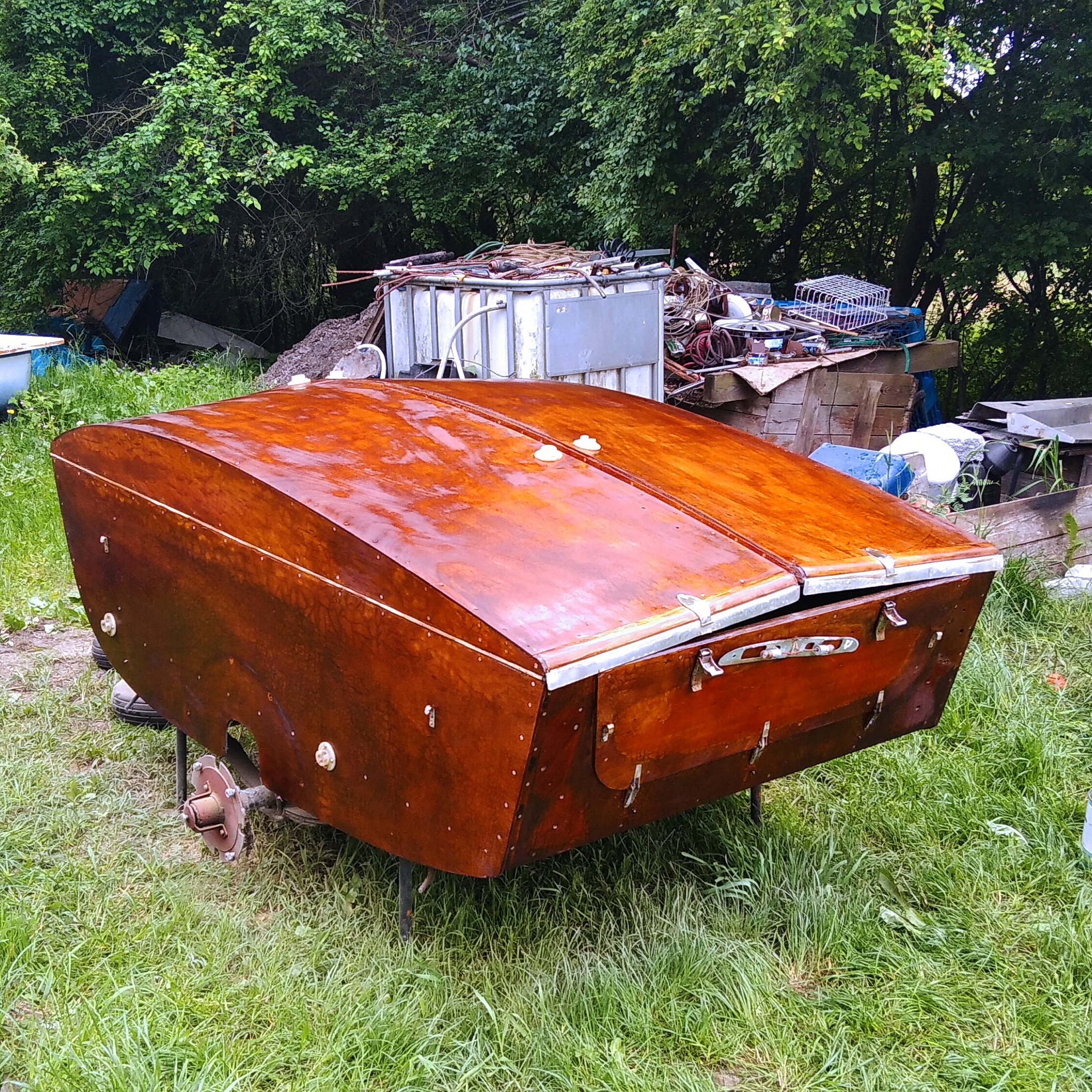 Trampek nabiera znów kolorów. Po przeszlifowaniu całej przyczepki nadszedł czas na bejcę a później dwie warstwy lakieru. Efekt wyszedł mega, widać plamy i spękania starego lakieru. W międzyczasie naprostowałem dekle kół i błotniki.
