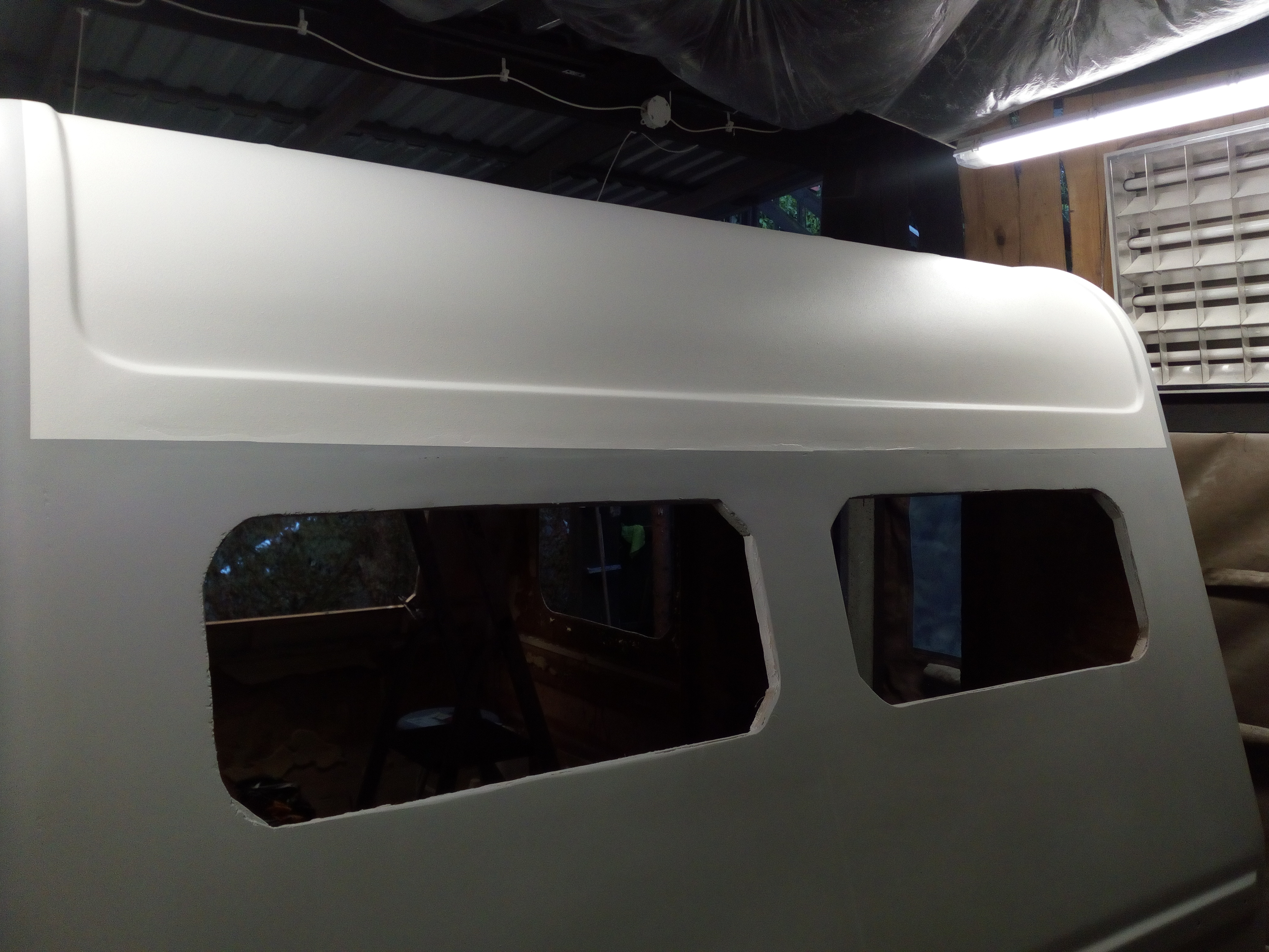 Odcięcia nie będzie widać; listwy okienne i kedrowe zasłonią. Tym czasem to już nie jest podkład, a w końcu pomalowana cała przyczepa!!!!! Jeszcze jak na złość przy ostatnim 0,5 litra pierdyknęła uszczelka pod głowicą w sprężarce. Resztę musiałem na 24litrowej; myślałem, że spuchnie z wrażenia.