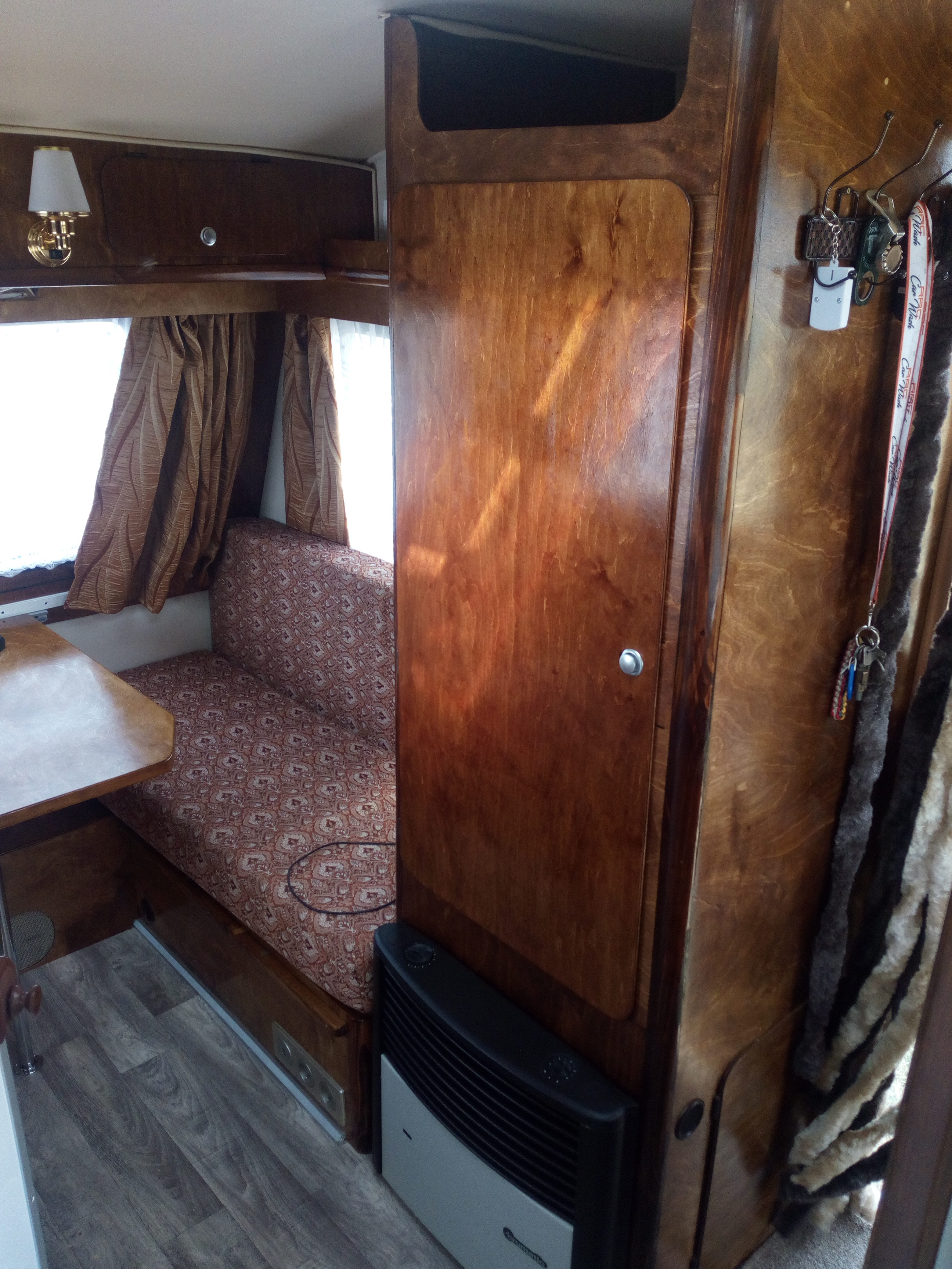 Drzwiczki małe na pewno się nie wypaczą , od szafy wzmocniłem, a pozostałe niestety czas pokaże, ale też mi przez głowę przechodzi żeby je usztywnić. Ela zaczęła szyć daszek, Filip jak zobaczył że tyle rurek z pozostałych przyczep mu się nazbierało to stwierdził że w sumie można przedsionek uszyć... Daszek jako daszek, a ściany dopinane. Pojawiły się też jakieś motywy w łazience żeby nie było tak biało, a i umywalka jest. W kuchni miała być roleta, ale jest zasłonka i firanka oraz deska do krojenia, która kształtem w zlew pasuje, a na czas gotowania można sobie tak o położyć.