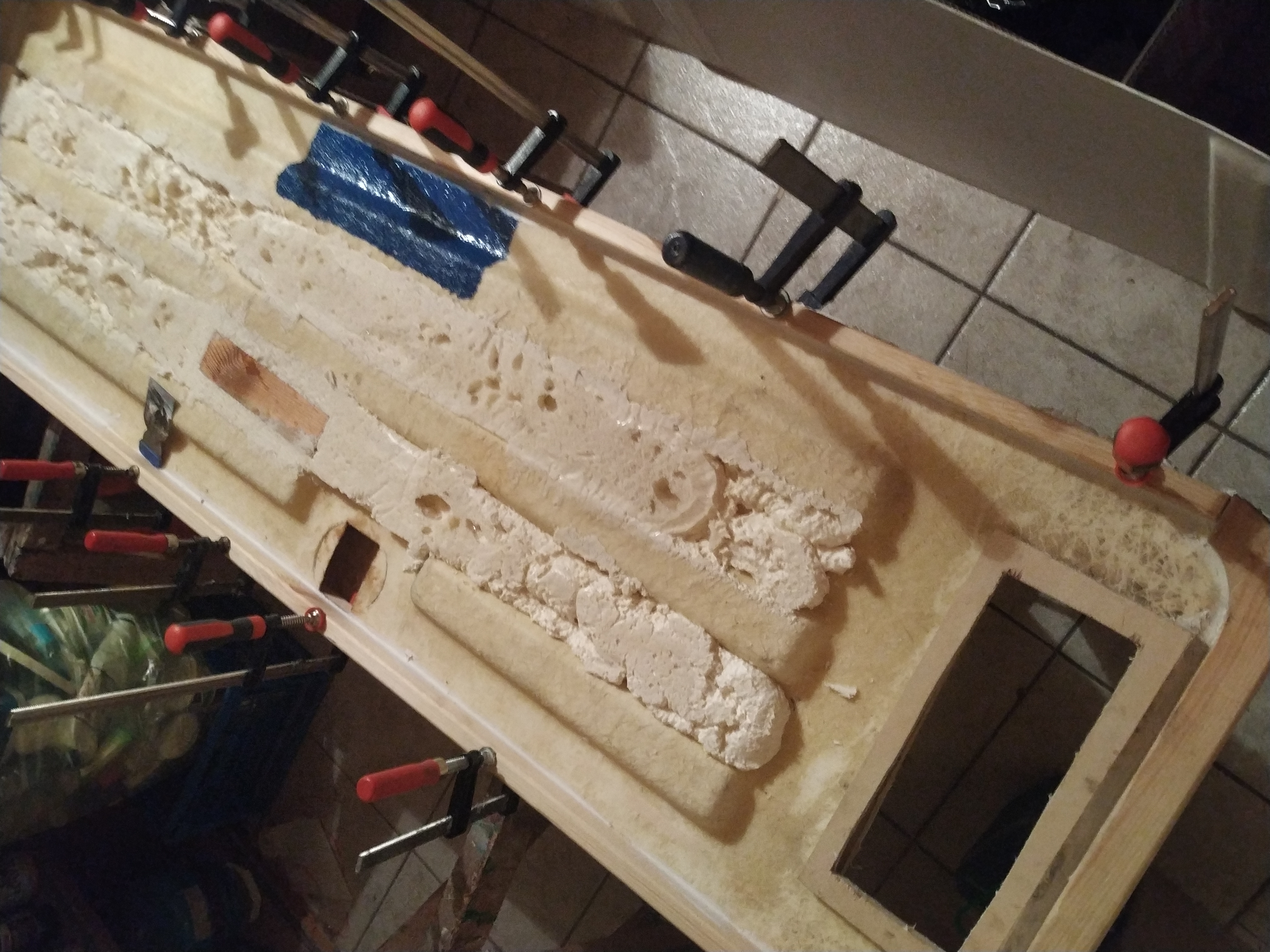 Spód wreszcie pomalowany. W zeszłą sobotę podkład, a dziś farba. Wycięty rant pod nowe okno dachowe i wklejona część zewnętrza ramki. Docięte i wklejone listwy do drzwi.