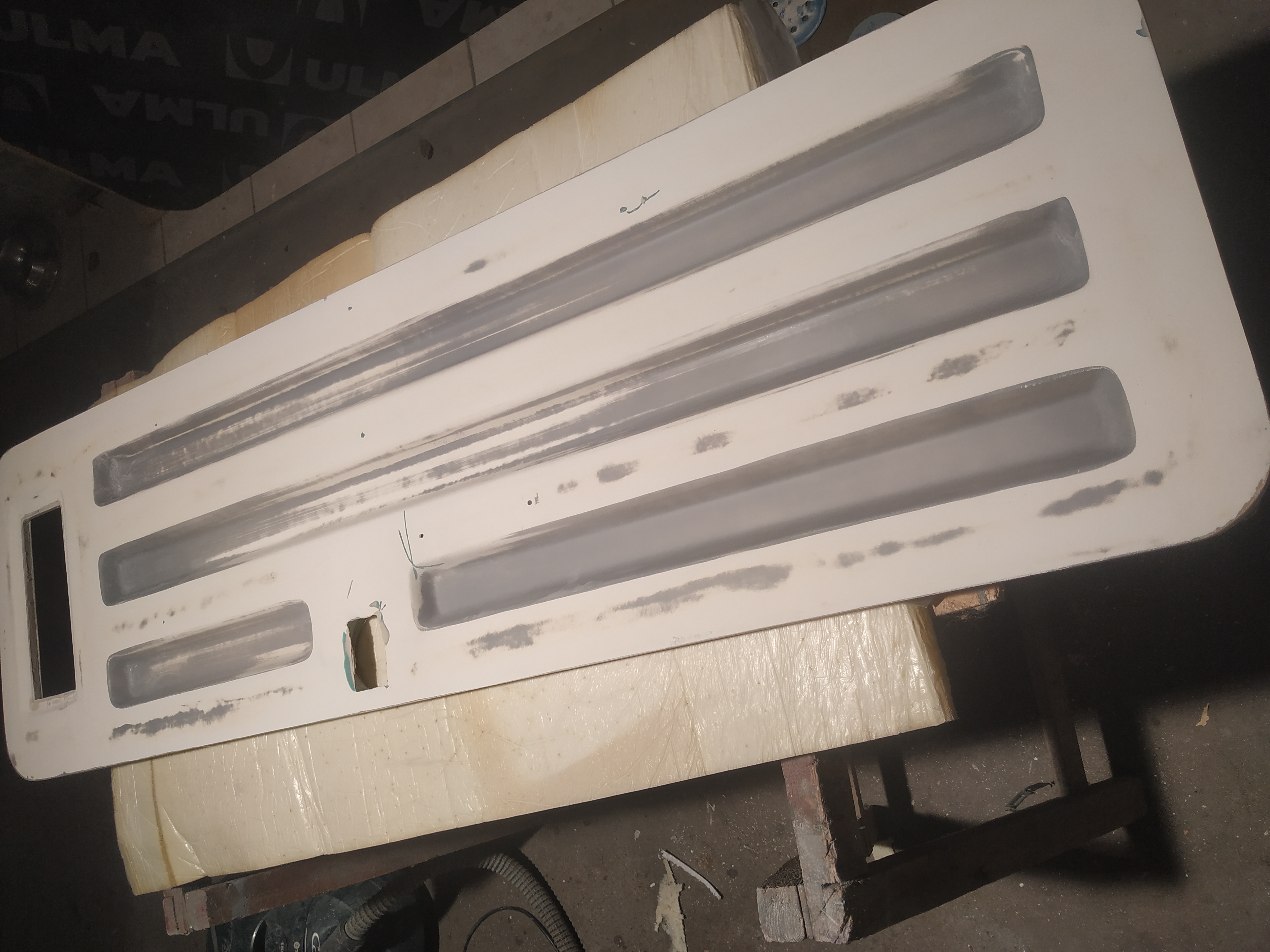 Możliwych rozwiązań było kilka: listewki + szpachla jak u Murano, styrodur+ inna żywica jak u Pavulona, Miron EZD proponuje poliuretan. Koncepcja z poliuretanem najbardziej mi spasowała - zacząłem więc tego materiału szukać. PUR w piance już używałem na wręgi i przy okienku dachowym, więc potwierdzam, że żywica poliestrowa nie żre tego. Płyta styrodurowa fajnie się obrabia i ma odpowiednią gęstość a jednocześnie wytrzymałość. Szukam więc płyty poliuretanowej. W marketach i składach budowlanych nie wiedzą o czym do nich rozmawiam. Doczytałem i okazuje się, że PUR to raczej natryskowo a całe płyty to pokryte blachą najczęściej występują a jak już znalazłem goły rdzeń to nie wysyłają. W ramach testu postanowiłem zrobić własną płytę