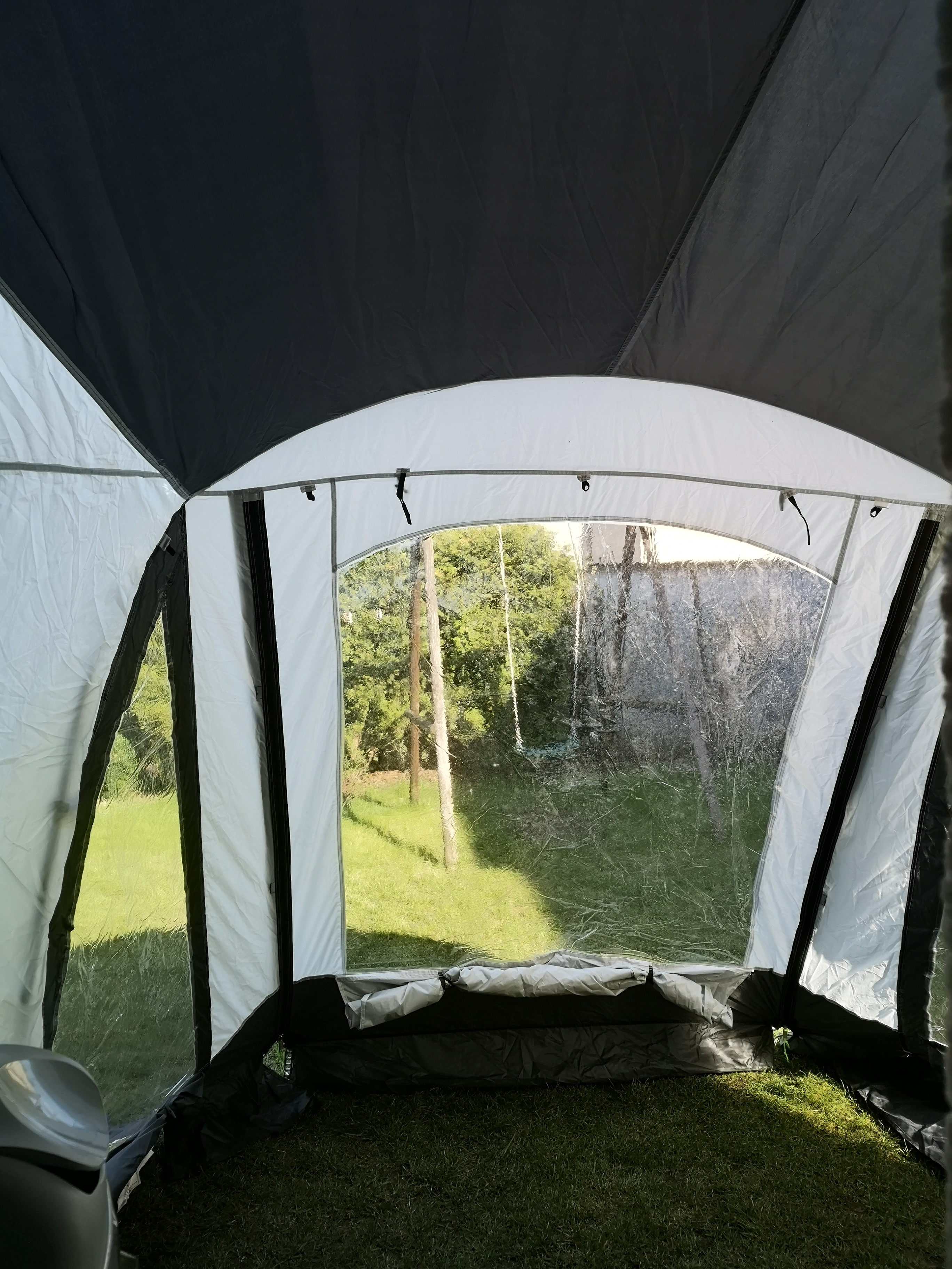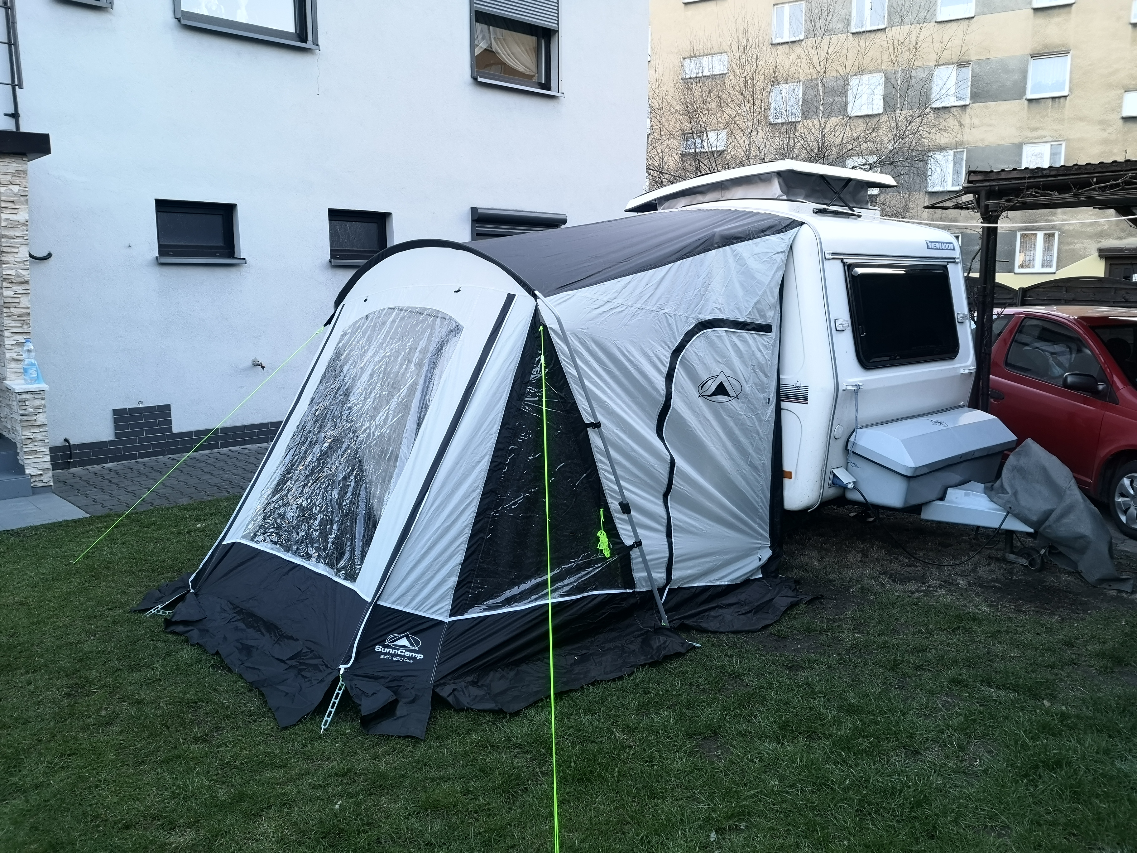 Fajnie. Ten patent od dawna chodził mi po głowie, jeszcze gdy jeździliśmy N-127. Myślałem o wożeniu dwóch "kołnierzy" dachu, jednego tradycyjnej moskitiery a drugiego w formie szczelnego materiału namiotowego. Ja tego nie zrealizowałem bo zmieniłem przyczepę ale od tamtej pory czasem nachodziła mnie taka myśl, dlaczego nikt się na takie rozwiązanie nie decyduje, skoro ogromnie poprawiłoby funkcjonowanie w przyczepie w czasie złej pogody, gdy więcej czasu spędzamy wewnątrz. Nawet ostatnio w Warce był ten temat poruszany.