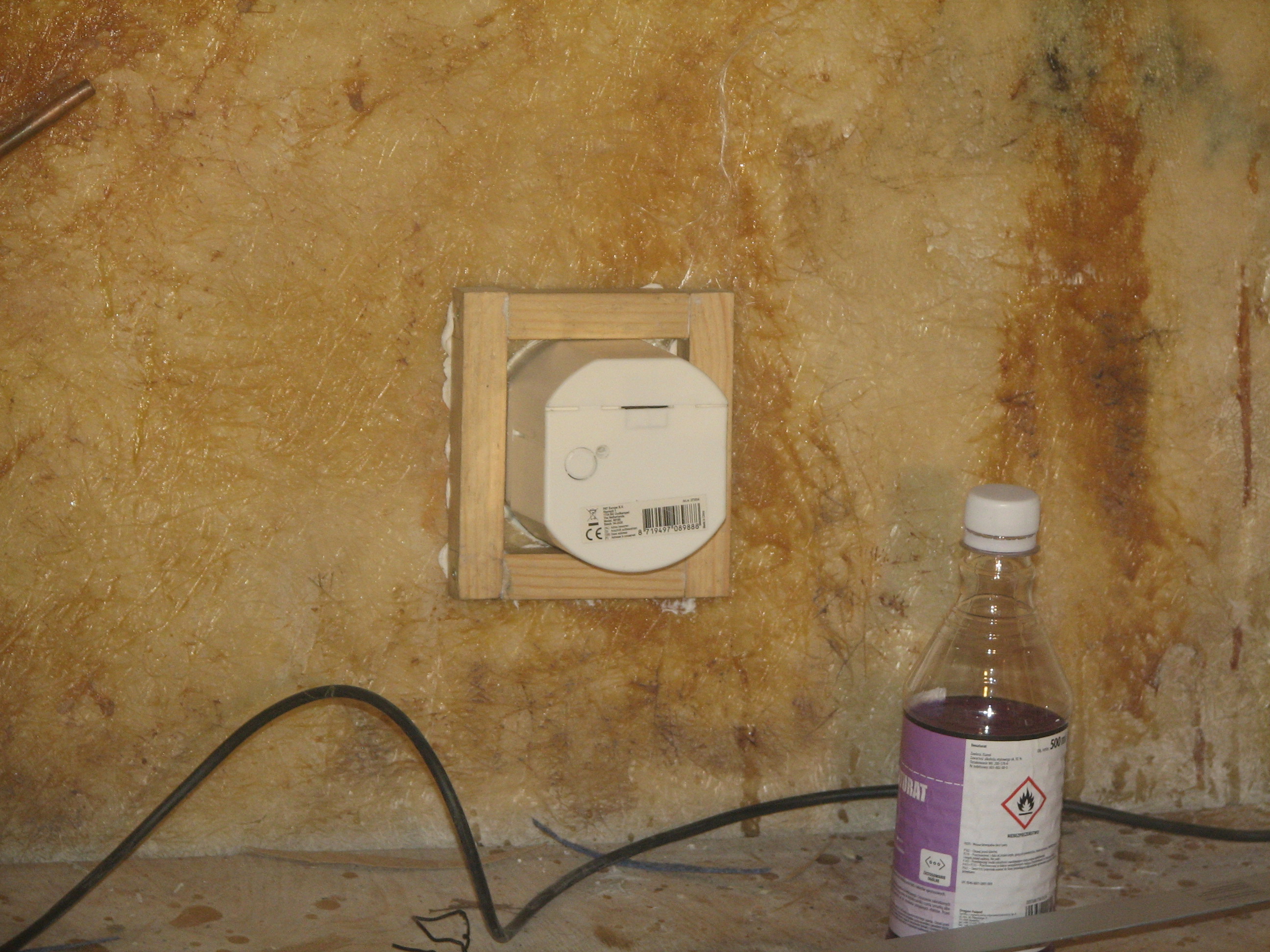 W międzyczasie zamontowałem gniazdo zasilające 230V typu CEE. Ponieważ siły potrzebne do włożenia i wyjęcia wtyki CEE są spore, zdecydowałem się dać ramkę wzmacniającą brzegi otworu gniazda. Wykonana została z listew 20x20mm sklejonych Mamutem i Mamutem przyklejona do ściany przyczepy. Gniazdo przykręciłem wkrętami nierdzewnymi 3,5x30mm. Między kołnierz gniazda i uszczelkę oraz między uszczelkę a ścianę budy nałożyłem uszczelniacz Sika Lastomer710.