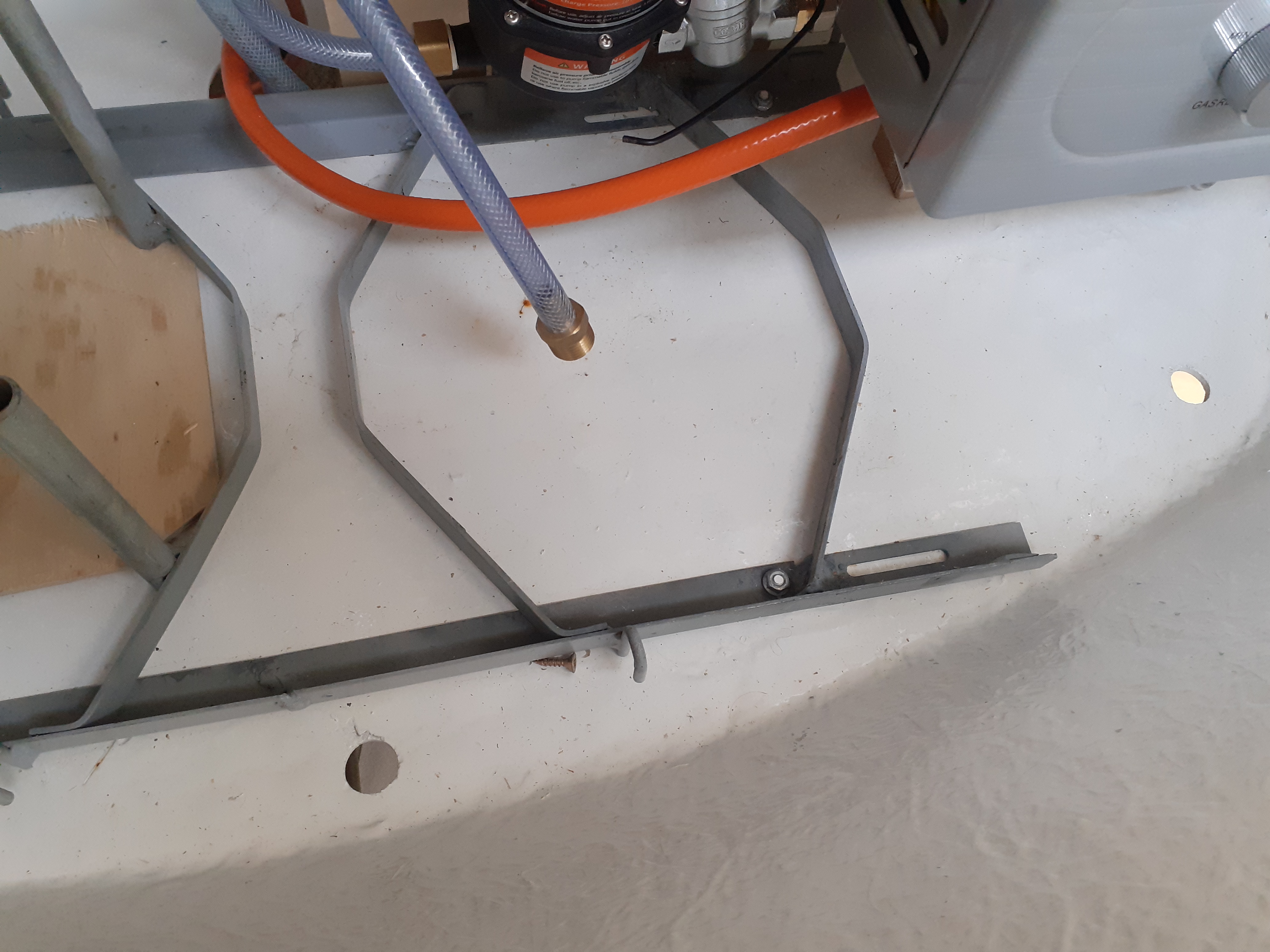 Kufer skręcony jest na 4 obejmach od dołu, a od góry przez kątowniki stelaża na butle. Dyszel nie jest wiercony. W poniedzialek mogę wysłać zdjęcie.