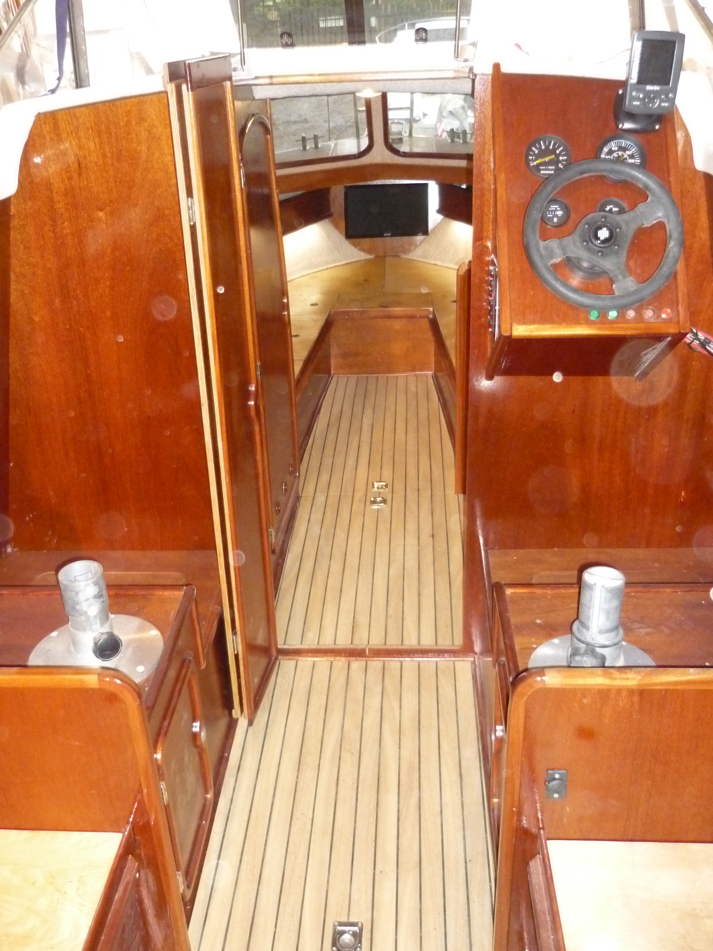 Co do mojej pierwszej wyprodukowanej łódki to proszę bardzo, zdjęcia poniżej, wyprodukowałem ją bodajże w 2007 roku w moim przydomowym garażu. Zresztą bardzo długo działałem w pojedynkę w domowym garażu. Jeśli chodzi o kopyto do gięcia drewna to nie mam pojęcia co niezwykłego może być w kilku deskach skręconych ze sobą? W mojej opinii zupełnie nic. Nie mam niestety zdjęć takiego kopyta, ale pozwolę sobie wstawić stolik nawigacyjny jako przykład gięcia na kopycie wykonanym z kilku skręconych do kupy sosonowych desek. Szkutnictwo to nie czarna magia ani NASA.