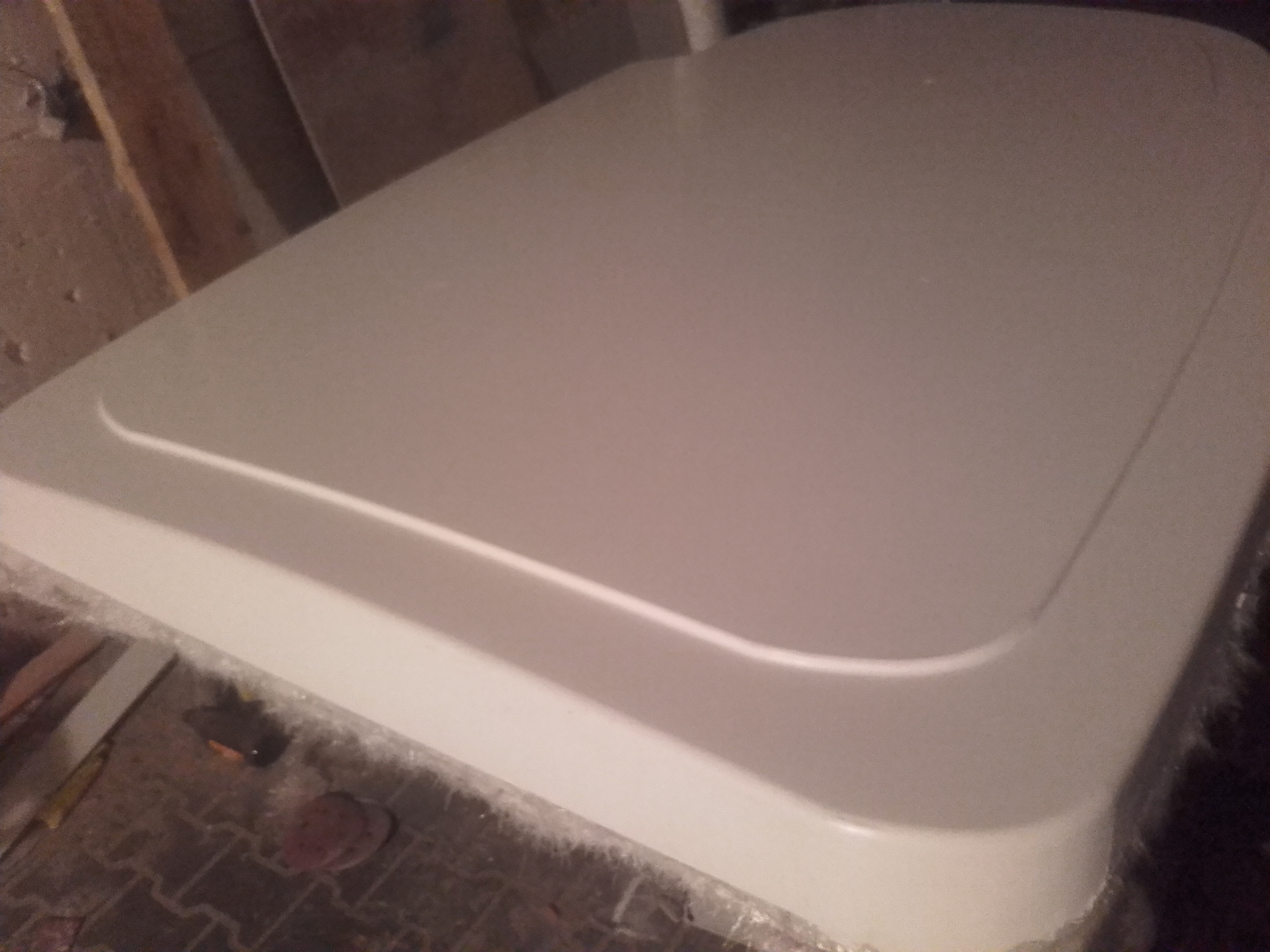 Ja wykonałbym brodzik na wymiar, z laminatu, tak jak błotniki. Wiem że na błotnikach może to być ciężko zrozumieć, dlatego wrzucam zdjęcia hardtopu (sztywnego dachu nad kokpitem), gdzie wewnętrzna warstwa jest w żelkocie. Wyobraż to sobie w ten sposób że stopy stały by okok kabelków, albo obok lampki (lampka może służyć jako pogląd na odpływ :) Wykonanie brodzika moim sposobem pozwala na zachowanie spadków tam gdzie chcemy a nie tam gdzie musimy, no i możemy wykonać przetłoczenie na odpływ, żeby był do niego spadek ze wszystkich stron.