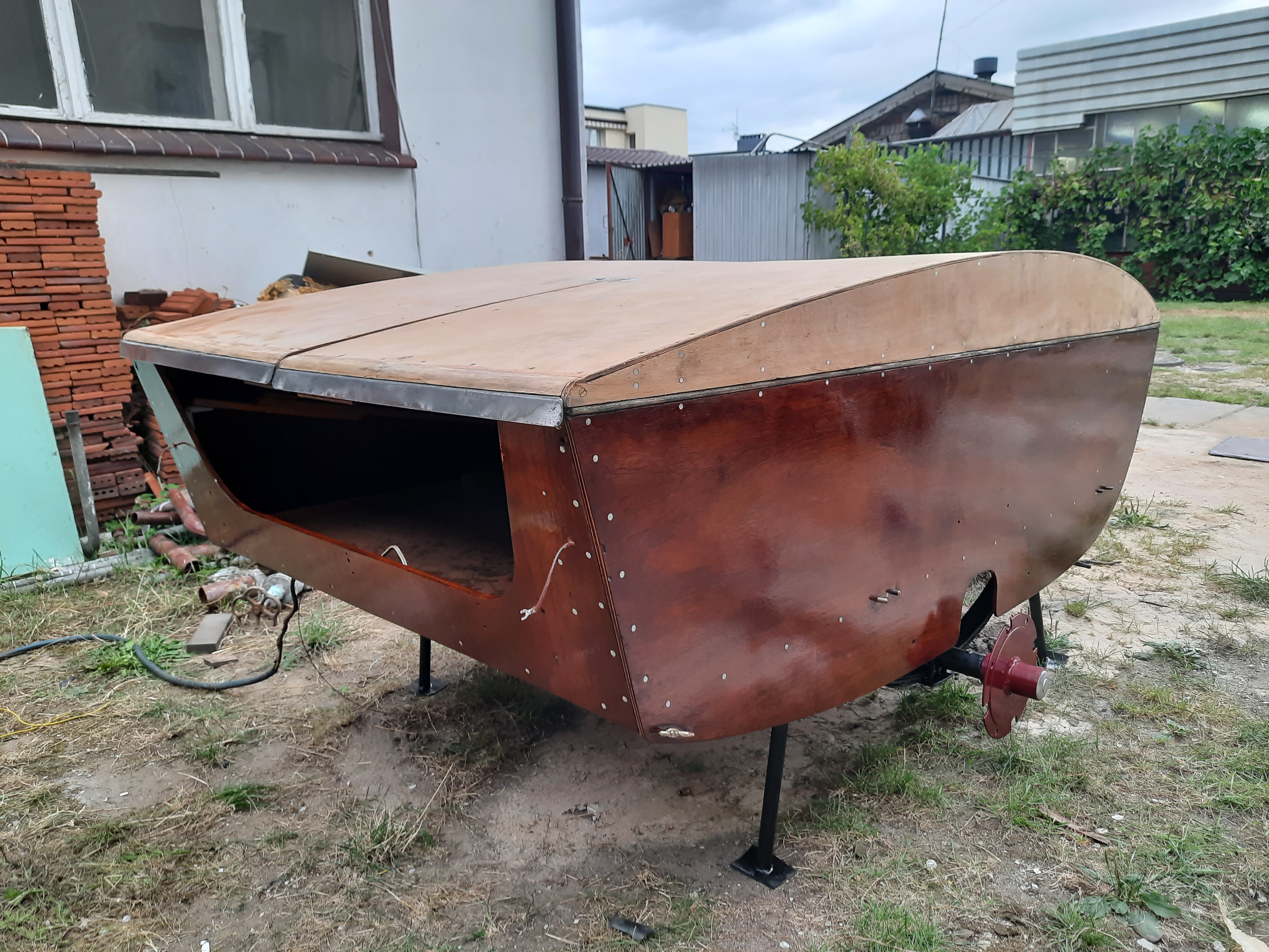 Wreszcie buda trafiła na ramę. Dolna część polakierowana jest już na gotowo. Na wszystkie szlifowane drewna kładę trzy warstwy lakieru jachtowego bezbarwnego w połysku. Po pierwszej warstwie jest jeszcze raz przeszlifowane 240.