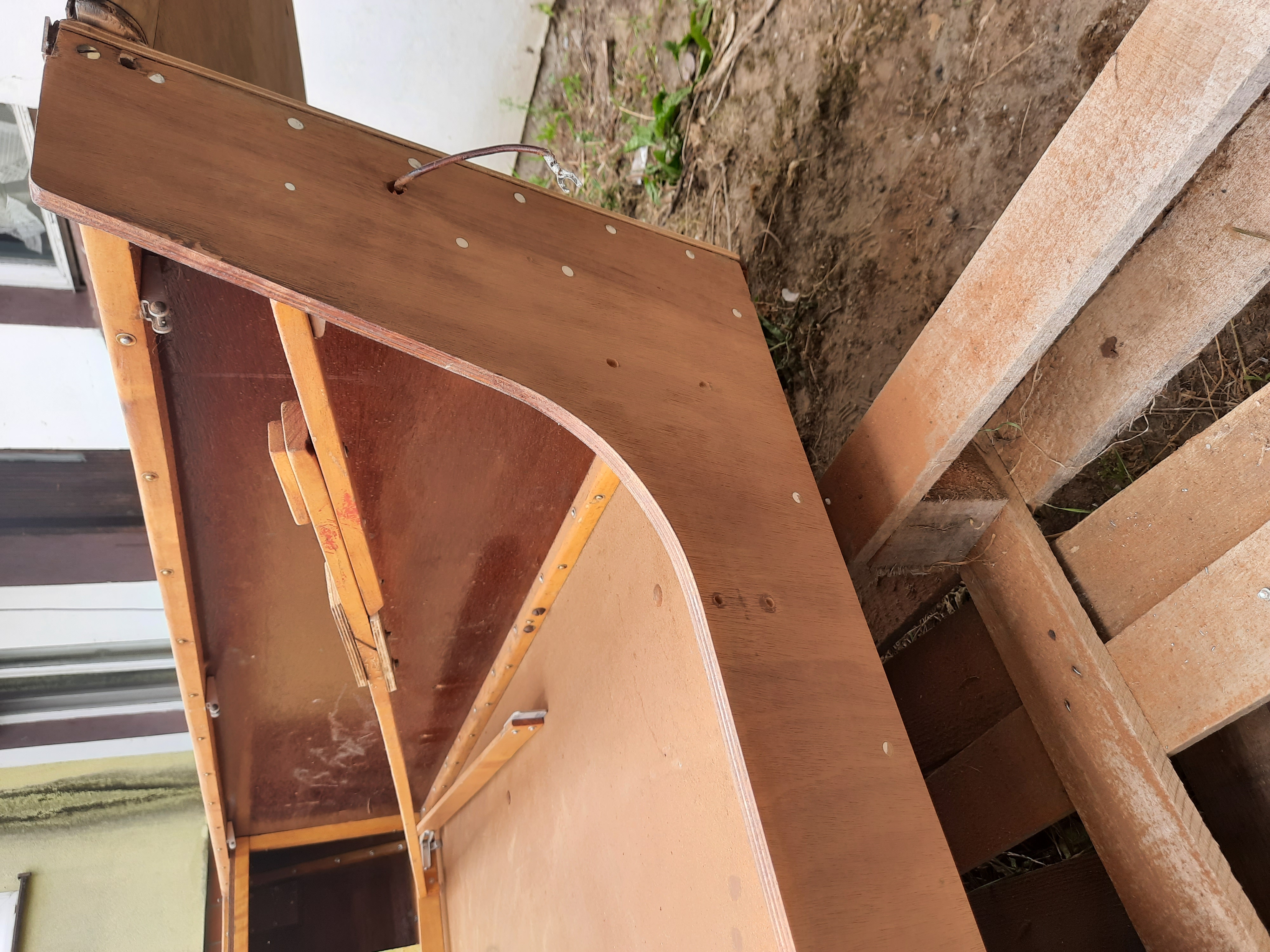 Wreszcie buda trafiła na ramę. Dolna część polakierowana jest już na gotowo. Na wszystkie szlifowane drewna kładę trzy warstwy lakieru jachtowego bezbarwnego w połysku. Po pierwszej warstwie jest jeszcze raz przeszlifowane 240.