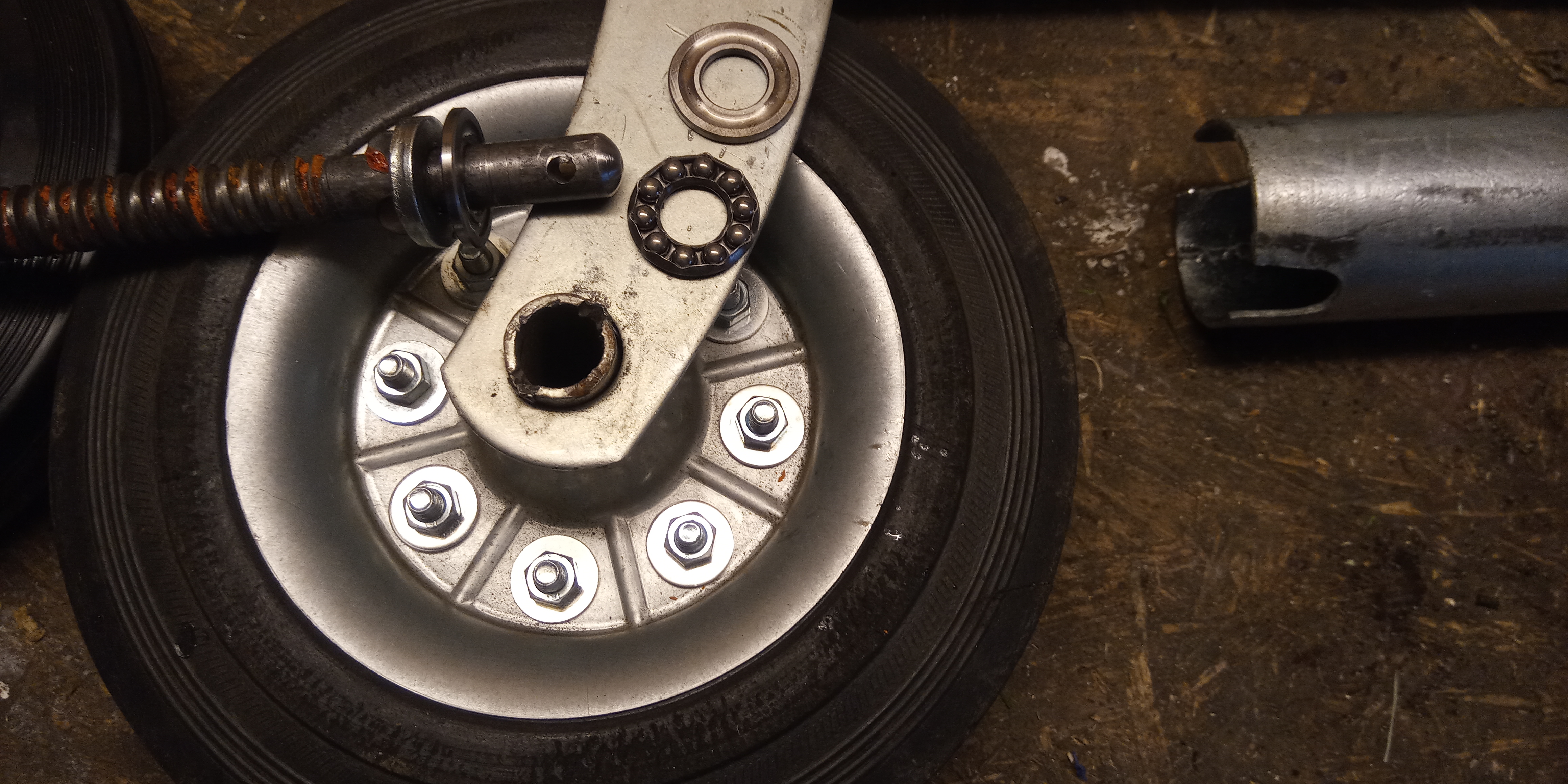 Wcześniej się nie przyglądałem ale dziś po zdjęciu koła z widełek postanowiłem dać mu drugą szansę. Pod dużym obciążeniem nity które łączyły dwie połówki felgi puściły i koło się rozlazło. Pozbyłem się resztek nitów, wyklepałem felgę tu i tam i skręciłem śrubkami z poszerzanymi podkładkami. Przy okazji rozebrałem cały uchwyt, nasmarowałem i złożyłem wszystko do kupy. Zobaczymy czy pożyje...