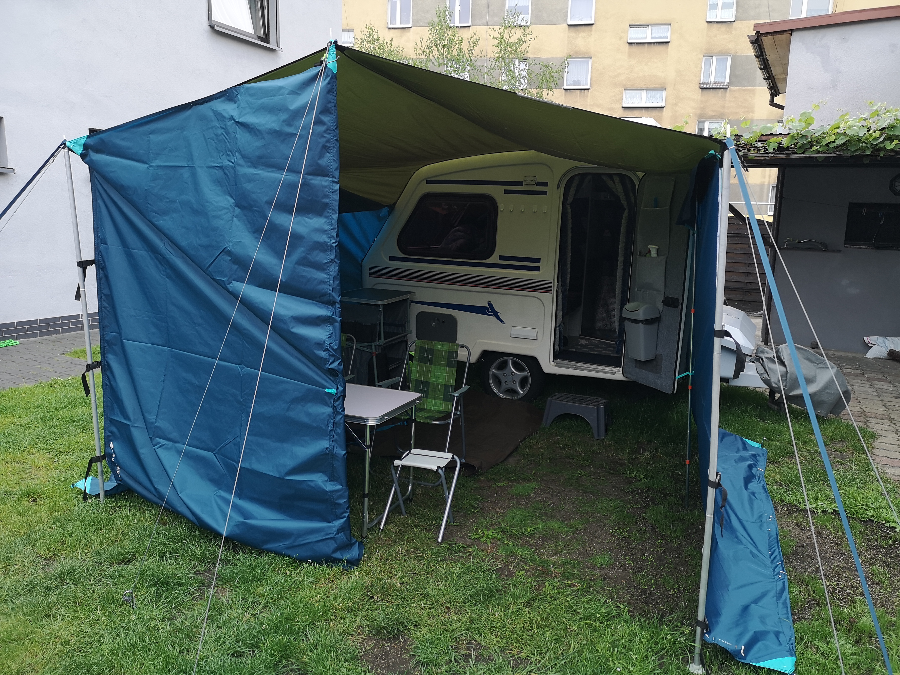 Fajnie. Ten patent od dawna chodził mi po głowie, jeszcze gdy jeździliśmy N-127. Myślałem o wożeniu dwóch "kołnierzy" dachu, jednego tradycyjnej moskitiery a drugiego w formie szczelnego materiału namiotowego. Ja tego nie zrealizowałem bo zmieniłem przyczepę ale od tamtej pory czasem nachodziła mnie taka myśl, dlaczego nikt się na takie rozwiązanie nie decyduje, skoro ogromnie poprawiłoby funkcjonowanie w przyczepie w czasie złej pogody, gdy więcej czasu spędzamy wewnątrz. Nawet ostatnio w Warce był ten temat poruszany.