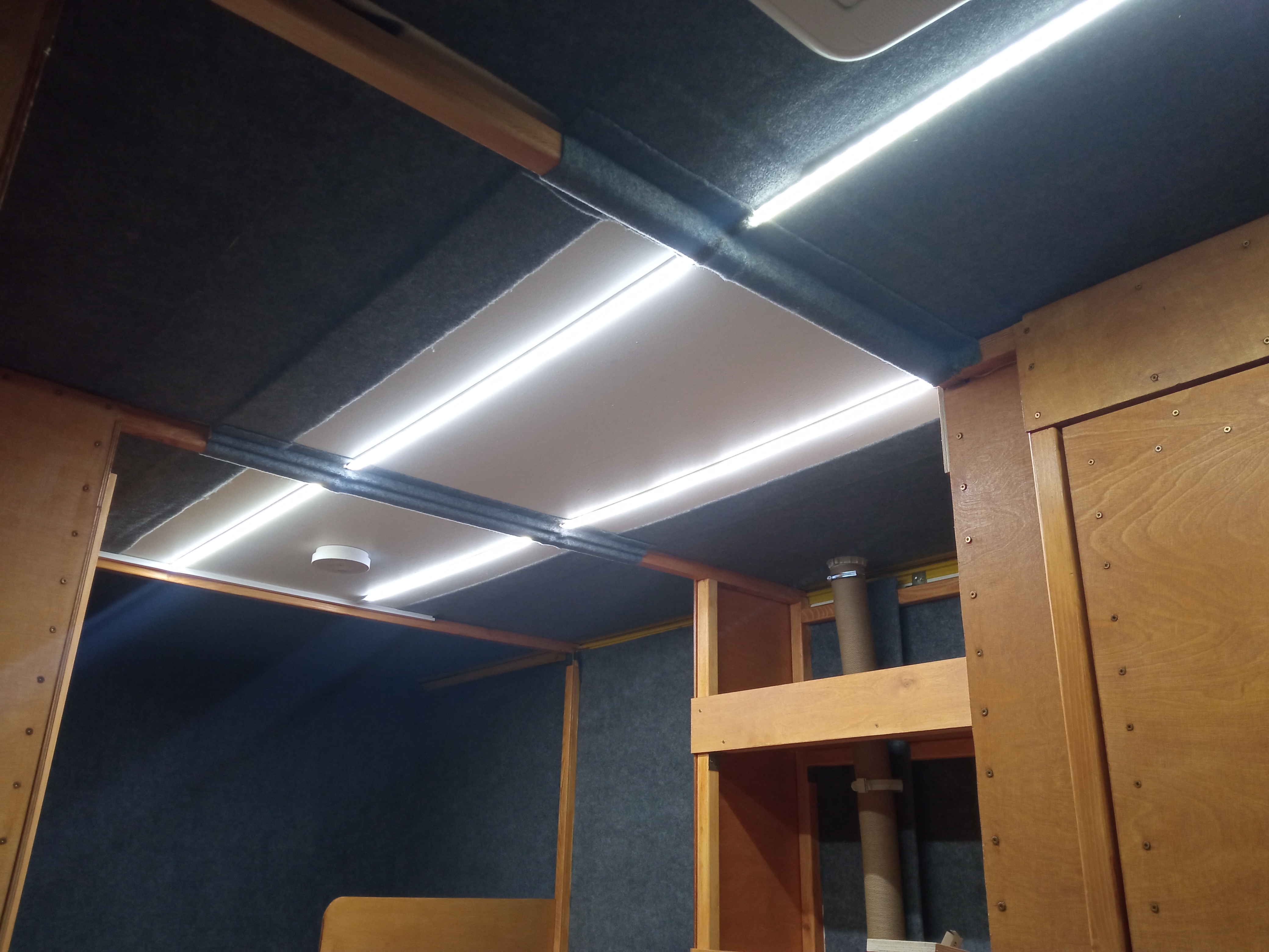 Elektrycznie - mamy ledy na suficie włączane włącznikami schodowymi przy wejściu do auta, lub przy łóżkach - włącznik na szafie. Oprócz tego - lampa nad aneksem kuchennym i w łazience. Wykorzystałem oryginalne oprawy które były w samochodzie, tylko wywaliłem wsad od jarzeniówek i wkleiłem taśmę led. Bardzo fajnie świecą, a do tego jest jakiś element oryginalności auta. Przy obydwu łóżkach zamontowane są kinkieciki Dometica, żeby można było w nocy poczytać i nie oświetlać całego samochodu.