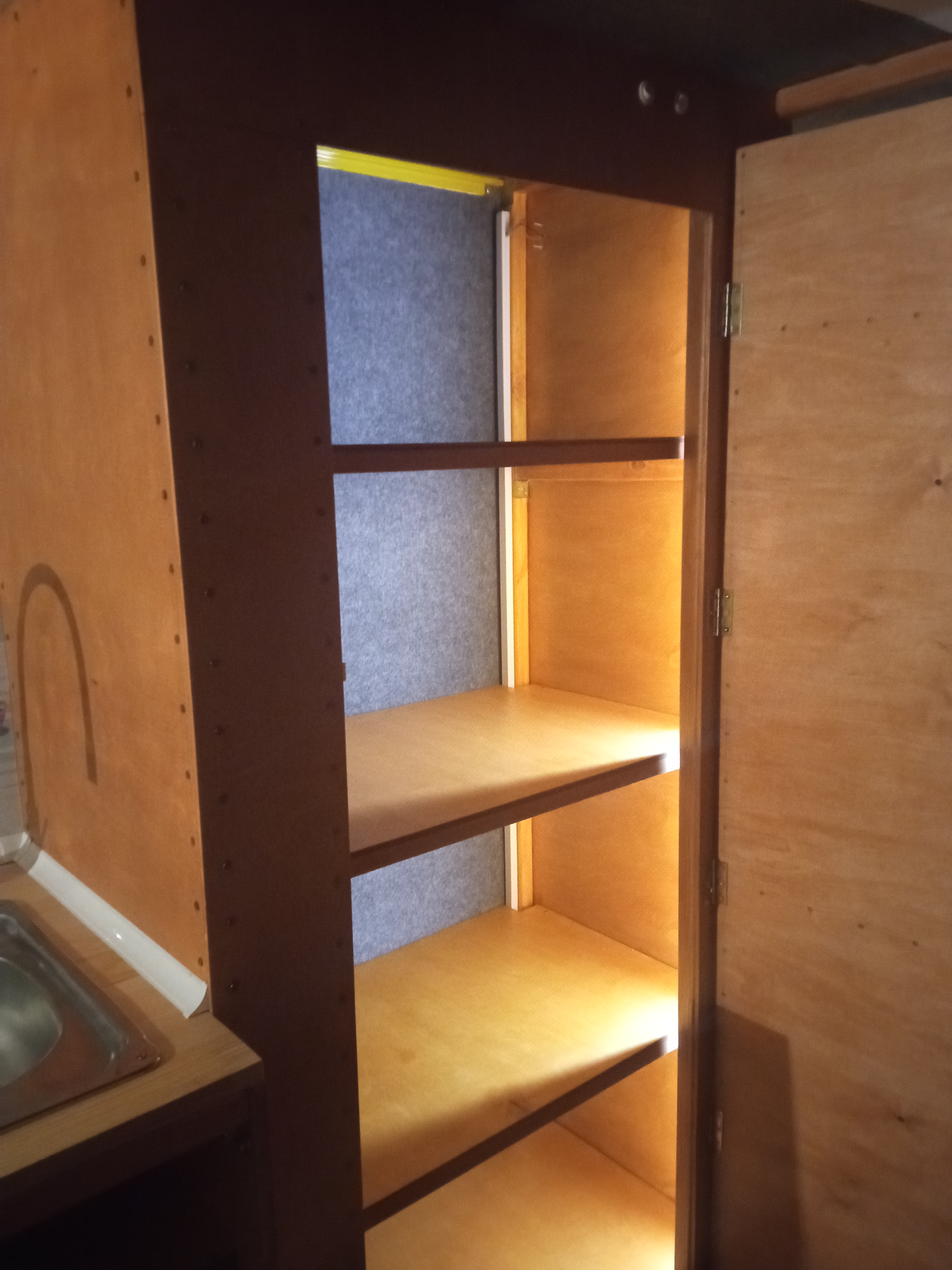 Co poza tym? Wpadły drzwiczki przez które będzie wyciągana butla z aneksu. Przy półkach nad Trumą dorobiłem barierki, dzięki którym graty przewożone na półkach nie wypadną w czasie jazdy. Muszę zabudować jakoś komin trumy żeby chronić go przed uszkodzeniami, mam na to pewien pomysł ale pochwalę się jak wyjdzie.