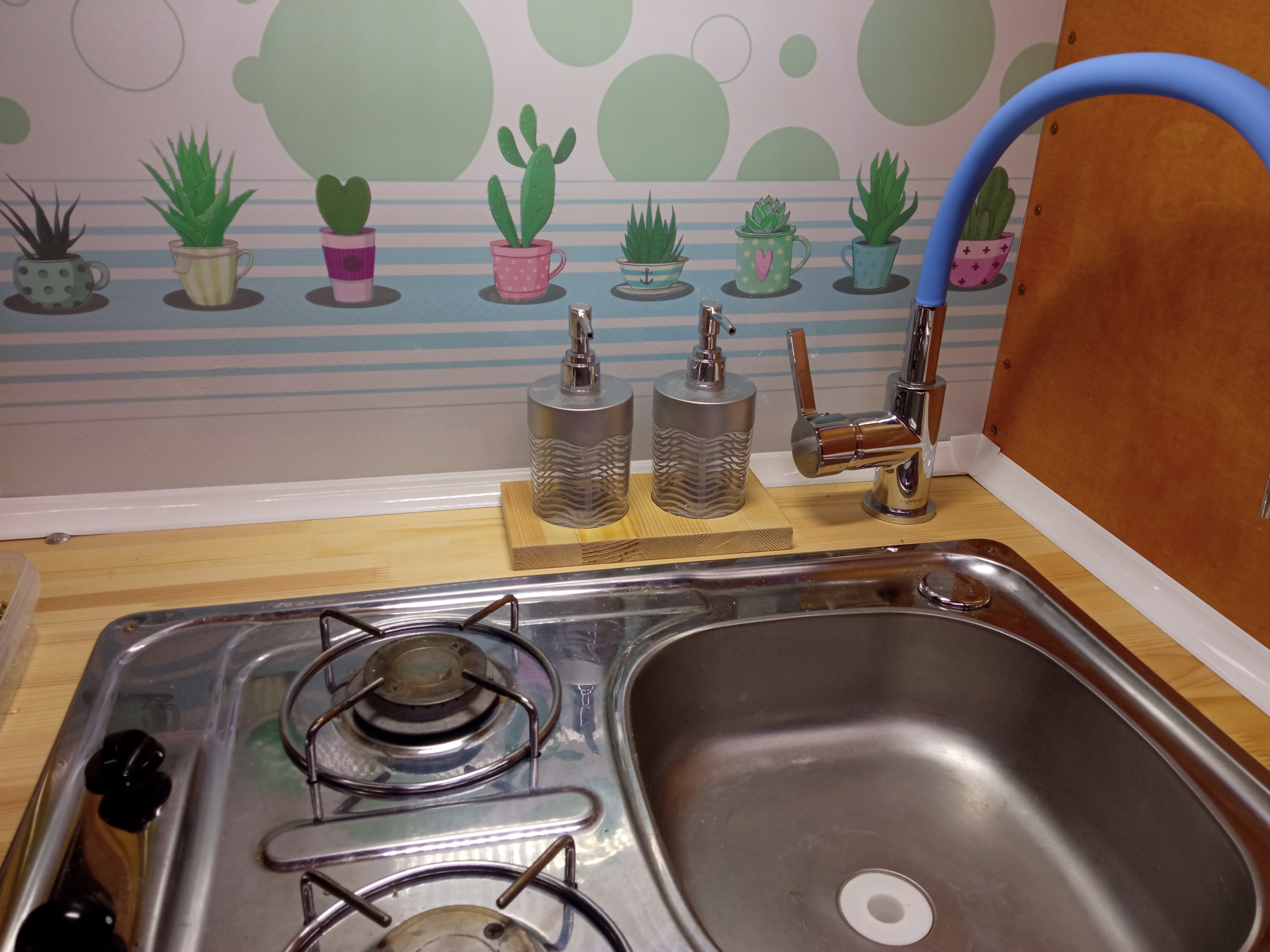 Dzisiaj dzień montowania dupereli haczyków itd. Między innymi stojaczek na dwa dozowniki - na płyn do naczyń i mydło. Trochę zonk, bo bardzo blisko kuchenki, ale niestety przestrzeń nie jest z gumy. Chyba zrobię to tak, aby w razie konieczności korzystania z palnika bliżej ściany, można było przestawić stojaczek, no albo można sobie po prostu wyjąć same pojemniczki z płynami.