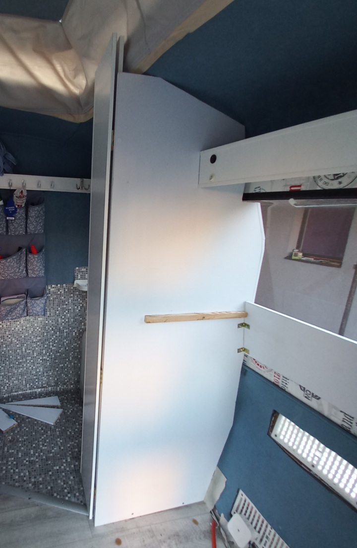 Pa majówce natchnęło mnie na przebudowę kuchni z łazienką. Postanowiłem wszystko wymontować solidnie przemierzyć co do cm... i zrobić od nowa juz tak całkowicie pod naszą trójkę. Najważniejsze to przedłużyłem o 11cm ściankę działową. Umywalkę zamieniłem stronami z WC. Dzięki temu wchodząc do przyczepy nie patrzy się na wprost na kibelek a i gotując coś w kuchni nie będzie już widoku na WC. Przy WC dojdą drzwiczki 20cm rozkładane na dwie części co da po rozłożeniu 40cm i będą odgradzały łazienkę do samego brzegu łóżka. Kuchnia będzie wyższa o minimum 10cm aby nie trzeba było się schylać. Dolna szafka na buty będzie szersza i wyższa. Z piekarnika rezygnuję bo w praktyce jezdzimy bardziej na dziko i mało z niego korzystaliśmy - w tym miejscu będzie przesuwna szafka. W miejsce zlewu wyląduje stały blat kuchenny. W praktyce korzystaliśmytylko z umywalki także drugi zlew był zbyteczny. Co do płyt do zastosowałem wiórowe, laminowane, szerokości 10mm.