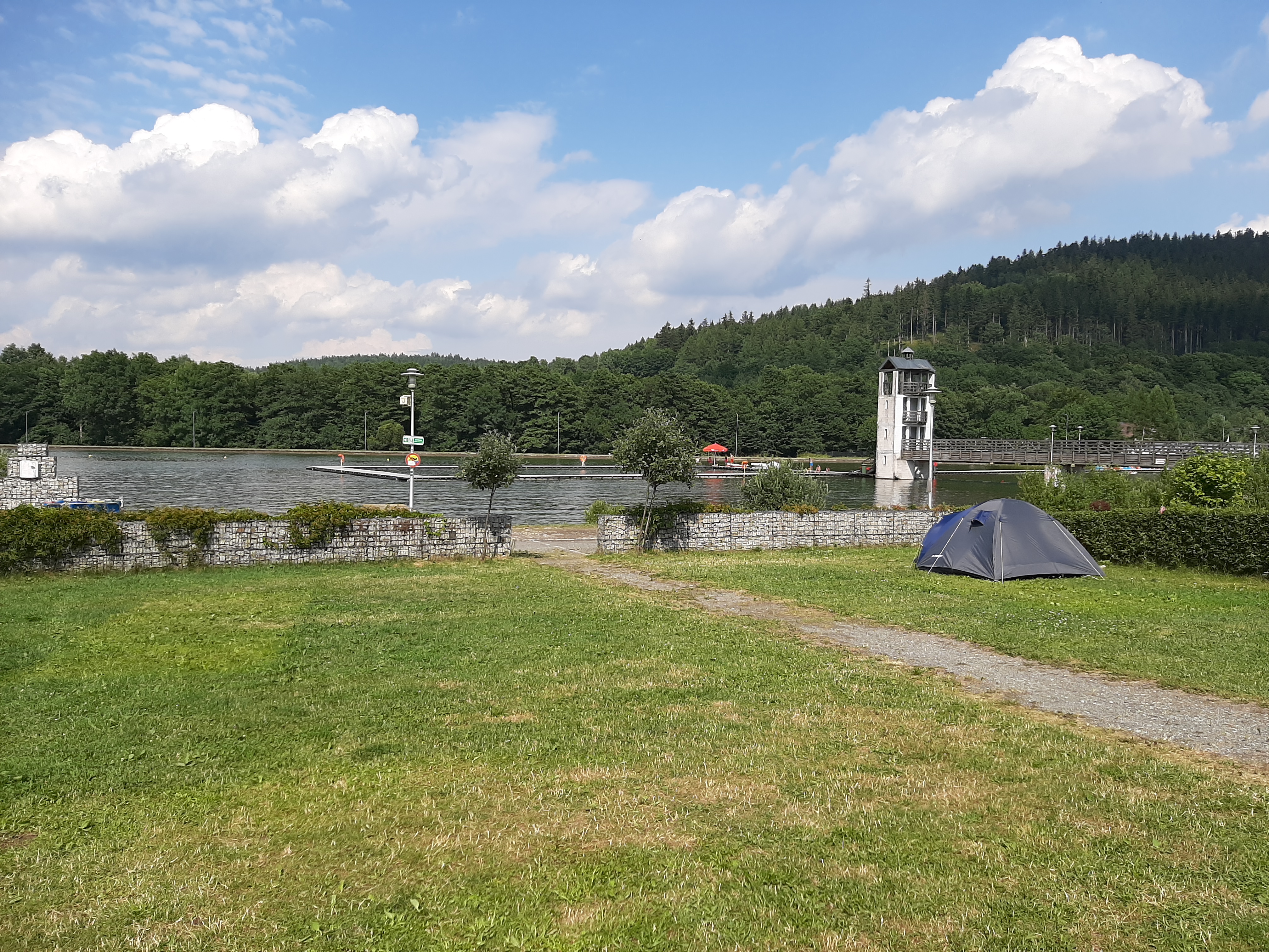 Teren pola biwakowego jest w całości trawiasty, równy ze spadkiem w kierunku zalewu bez wytyczonych parcel. Znajdziecie tam miejsca zacienione jak i w pełnym słońcu.