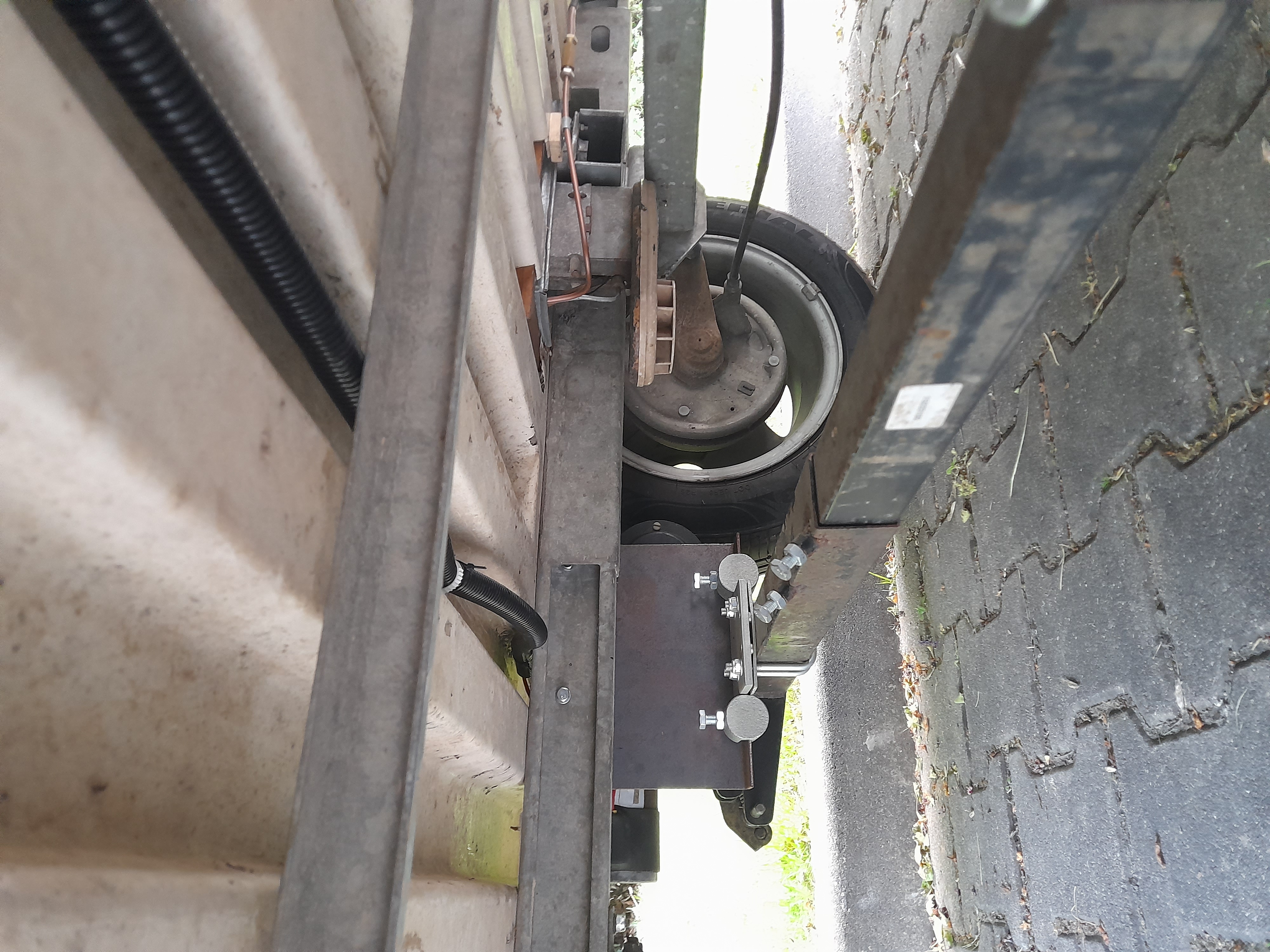 Teraz należało wymyślić sposób zamocowania movera do ramy przyczepy. Pierwsze pytanie było gdzie, czyli czy przed osią, czy za osią. Zasadniczo, lepiej by było przed osią, bo wtedy błoto z koła nie chlapie na mover, a ponadto jest korzystniejszy rozkład sił na rolce napędzającej. Jednak, niestety, u mnie mocowanie przed osią było niemożliwe, bo konieczne by było zlikwidowanie składanego schodka, na co wcale nie miałem ochoty. W rezultacie więc mover wylądował za osią przyczepy.