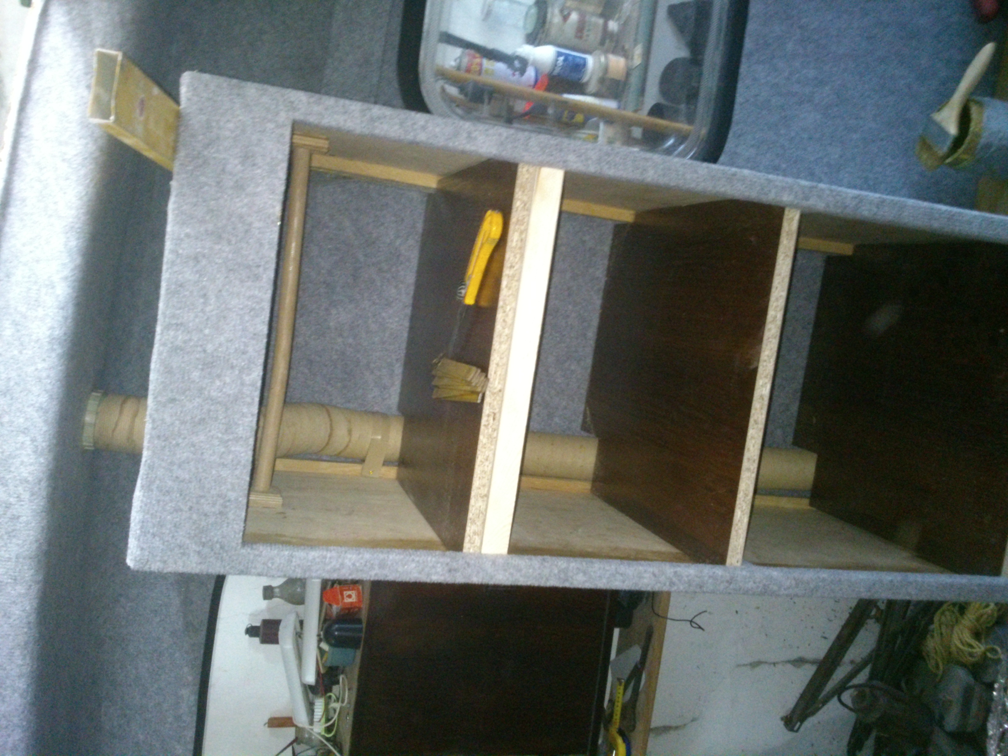,otwór w daszku wywierciłem otwornicą za 5zł od Chińczyków idealnie pasuje to największe kółko. Drzwiczki do szafy kupiłem nowe a boki wykleiłem wykładziną,w poniedziałek biorę się za obudowanie trumy -tego boku co wystaje,nie widzi mi się takie rozwiązanie ale tego już nie przeskoczę.