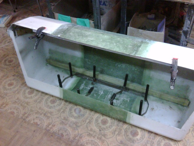 wykonane wstawki, tniemy kufer i klapę w połowie i łączymy przy pomocy listew drewnianych /20x10/ odpowiednio polówki zostawiając środek pusty do wypełnienia -u mnie ten wymiar był 54 cm. Listwy wkleiłem na żywicę przykręcając wkrętami od zewnątrz kufra i całość zalaminowałem tkaniną szklaną o gramaturze 300g/m2. Następną czynnością jest zdarcie żelkotu na ok 10cm i po docięciu "wstawek" ich wklejenie na listwy i zalaminowanie kolejnymi 2-3 warstwami maty szklanej od góry i spodu tez. Przedtem warto wkleić pionowe pasy grubej tkaniny szklanej w miejscu łączenia co zapobiegnie pękaniu złącz. Teraz mamy ze dwa dni na piwo żeby to wszystko stwardniało i szpachla w ruch. Kupiłem tania szpachle z pyłem aluminiowym bo mam do niej zaufanie. Ten etap jest bardzo pracochłonny . Następnym krokiem jest montaż próbny, zabudowanie zawiasów, zamków /Castorama/ i wyczyszczenie papierem 300-400 do malowania farba podkładową /oczywiście rozmontowane/.Podkład polisterynowy,po wyschnięciu kontrola powierzchni bo dopiero widać nierówności, troszkę szlifowania i końcowe malowanie. Ja użyłem farby akrylowej tzw przemysłowej/po wyschnięciu twarda!/.Oczywiście znowu czas na piwo.