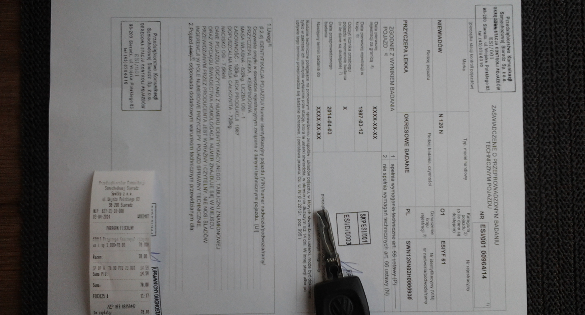 Byłem dziś po przyczepę i zaciągłem ją na przegląd. Diagnosta był naprawdę uprzejmym człowiekiem i w sumie opisał cały problem w taki sposób, że być może nie będę musiał pisać do Niewiadowa po odpis homologacji, ale dzięki serdeczne dla pawlo i fiony za chęć niesienia pomocy. Być może będzie to potrzebne, ale oby nie. Cały nr win jest na ramie, tabliczka także zgodna z odpisem homologacji, tylko dane wagowe w dowodzie do bani. Przegląd oczywiście negatywny z uwagi na niespójność danych w DR, co jest przedmiotem całego zamieszania. Mam też adnotację o braku ingerencji w pole numerowe o co prosili w WK i dlatego w sumie wymagali badań technicznych. Teraz muszę napisać podanie, złożyć papiery i czekać na mam nadzieję nowy dowód z całym numerem a nie tylko 3 ostatnimi cyframi i prawidłowymi danymi wagowymi.