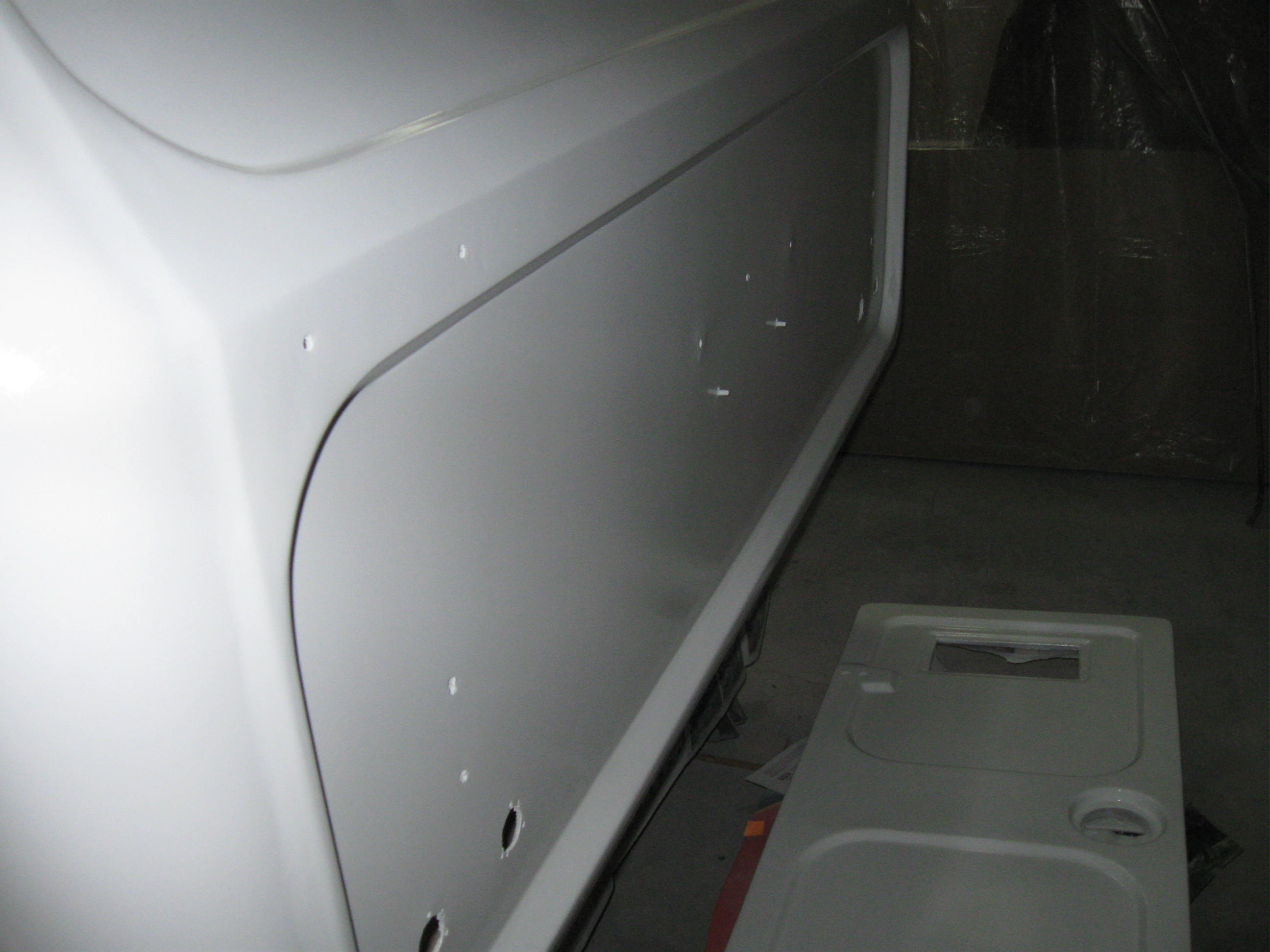 W zeszłym tygodniu dotarła paczka z częściami więc mogę kontynuować składanie.Robota trochę mozolna zwłaszcza,że często brakuje "trzeciej ręki".Wczoraj z pomocą brata założyłem listwy aluminiowe.Jako uszczelnienie zastosowałem taśmę butylową.Montowaliśmy za pomocą nitów aluminiowych.Efekt ok chociaż miejscami nie dolega idealnie.Próbę montażu klina ozdobnego przeprowadziłem na listwie aluminiowej "kufra".