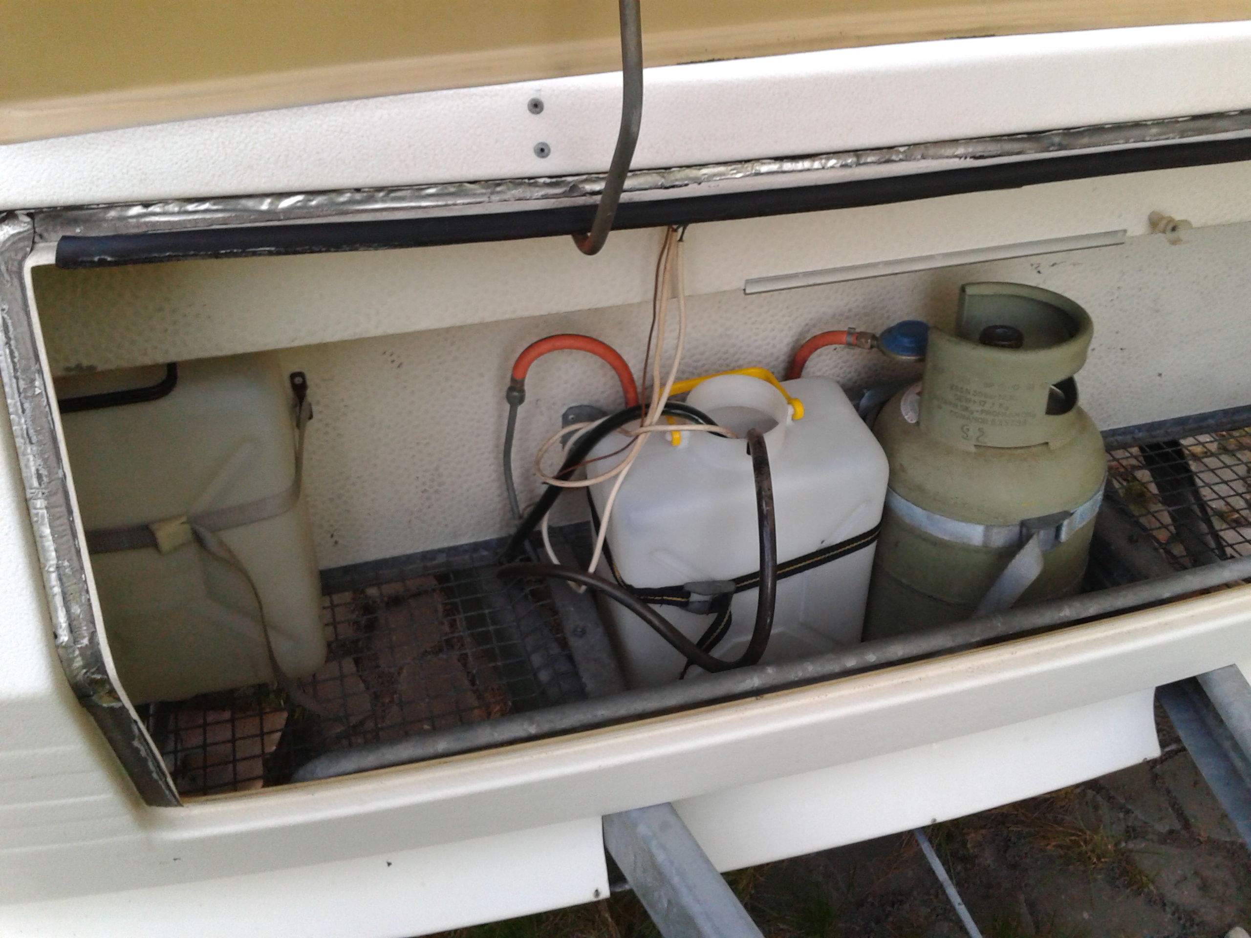 W bakiście z przodu mam to co wszyscy czyli butlę, dwie bańki na wodę i pompki na wężach do kuchenki i łazienki.
