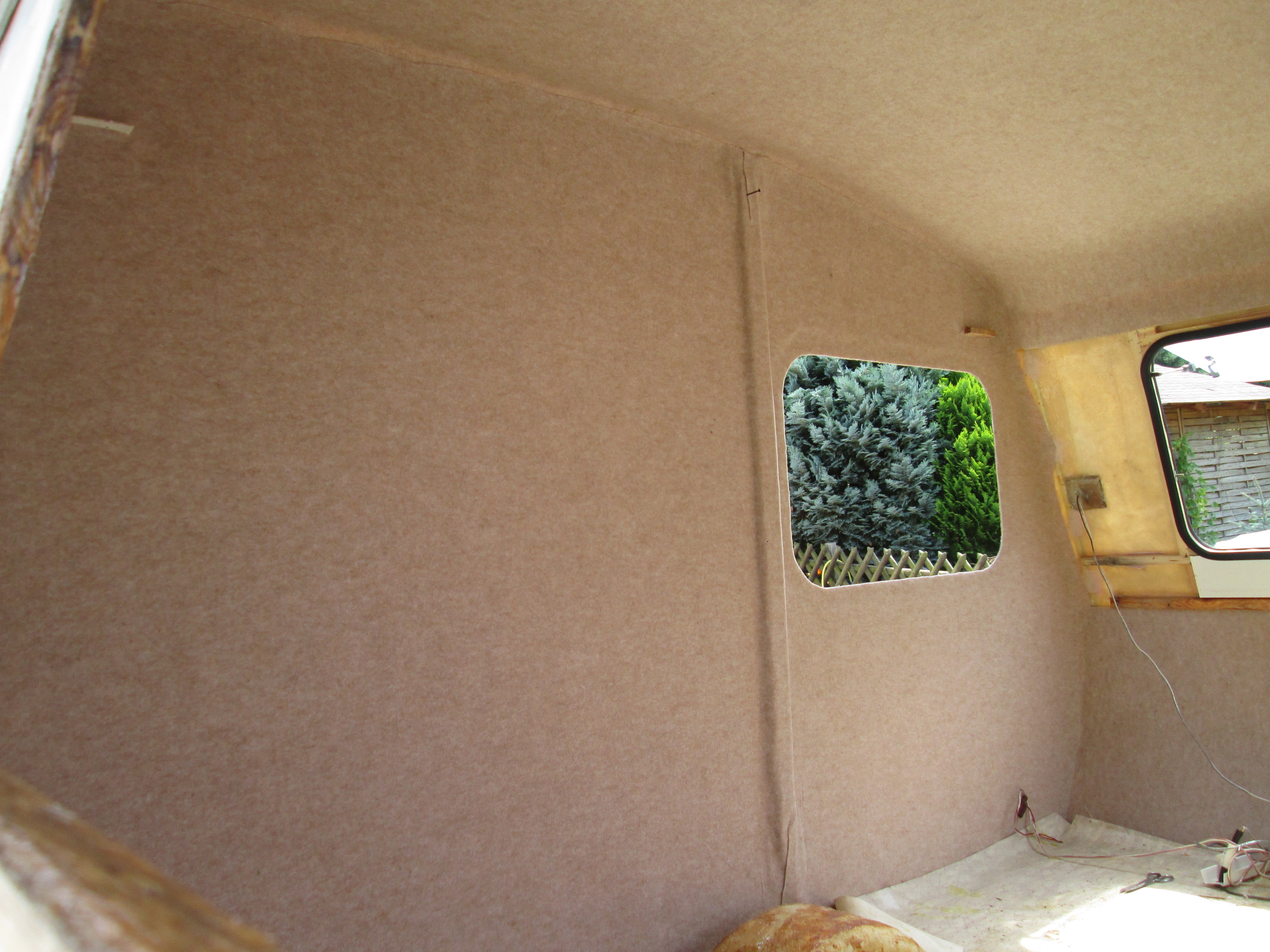 i wg niej rozpocząć klejenie ponieważ dach nie jest płaski to myślę że nad szafą ubraniową potrzebne cięcie poprzeczne , aby wykładzina się ułożyła na kszywiznie dachu , ja składałem płytę z dwóch części i gimnastykowałem się z kształtem łuku poprzecznego i wzdłużnego