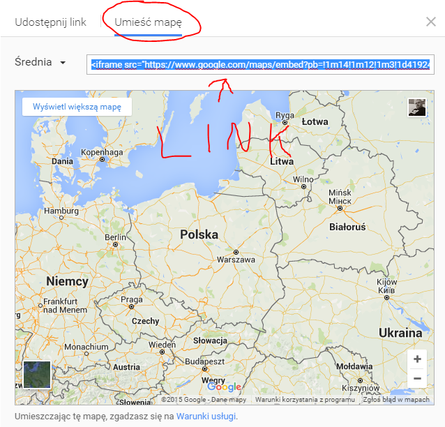 W wyświetlonym oknie wybieramy "umieść mapę" i kopiujemy widoczny link