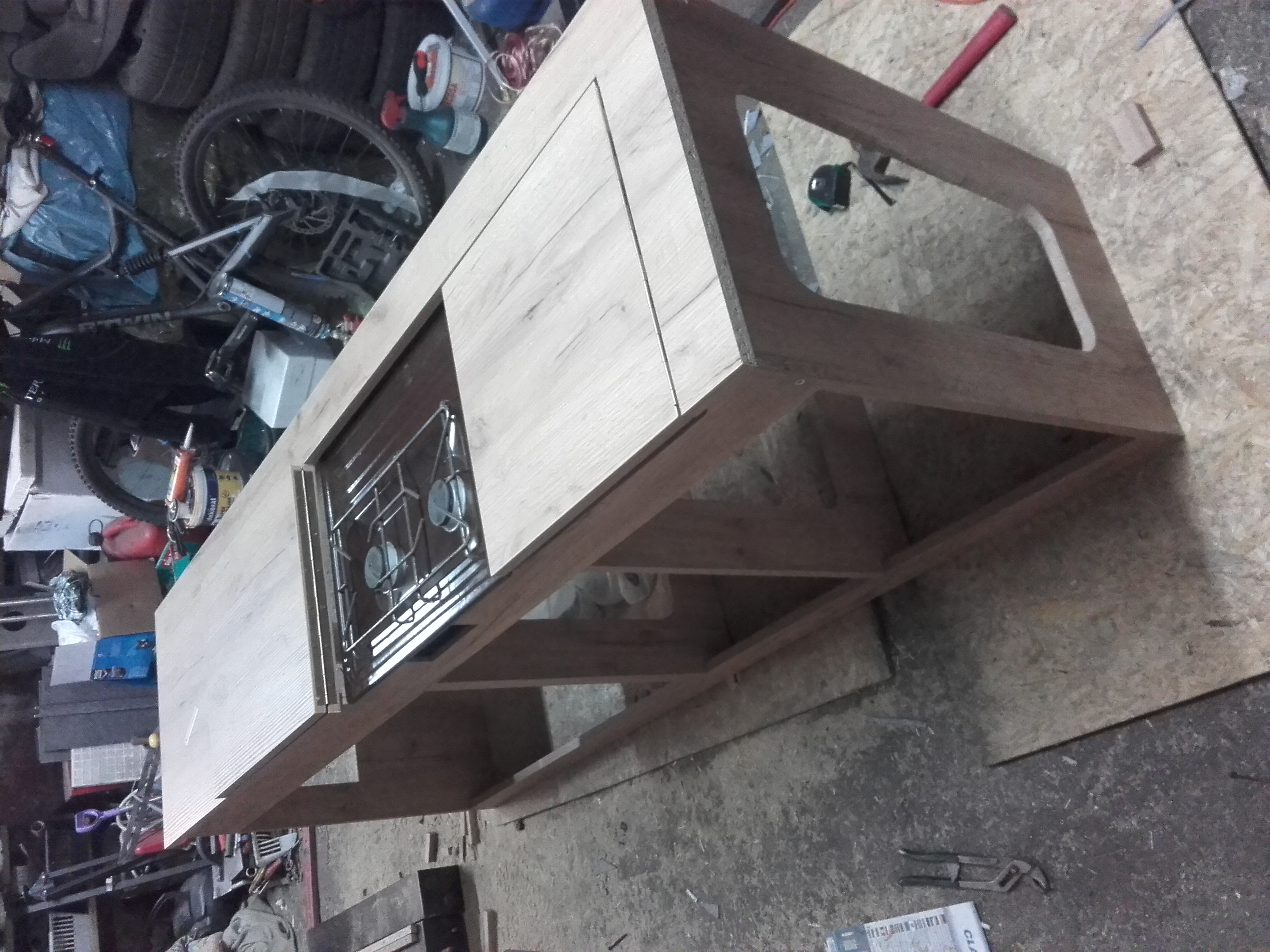 Ciężka jest szafa ok. 15kg może wiecej. Szkielet szafek kuchennych jakieś 10kg blat 8kg siedziska są wykonane z kantówki i płyty osb 10mm plus płyta z tyłu o dwie z przodu 7kg szafka na nadkole 10kg. W sumie pi razy drzwi ok.50kg.