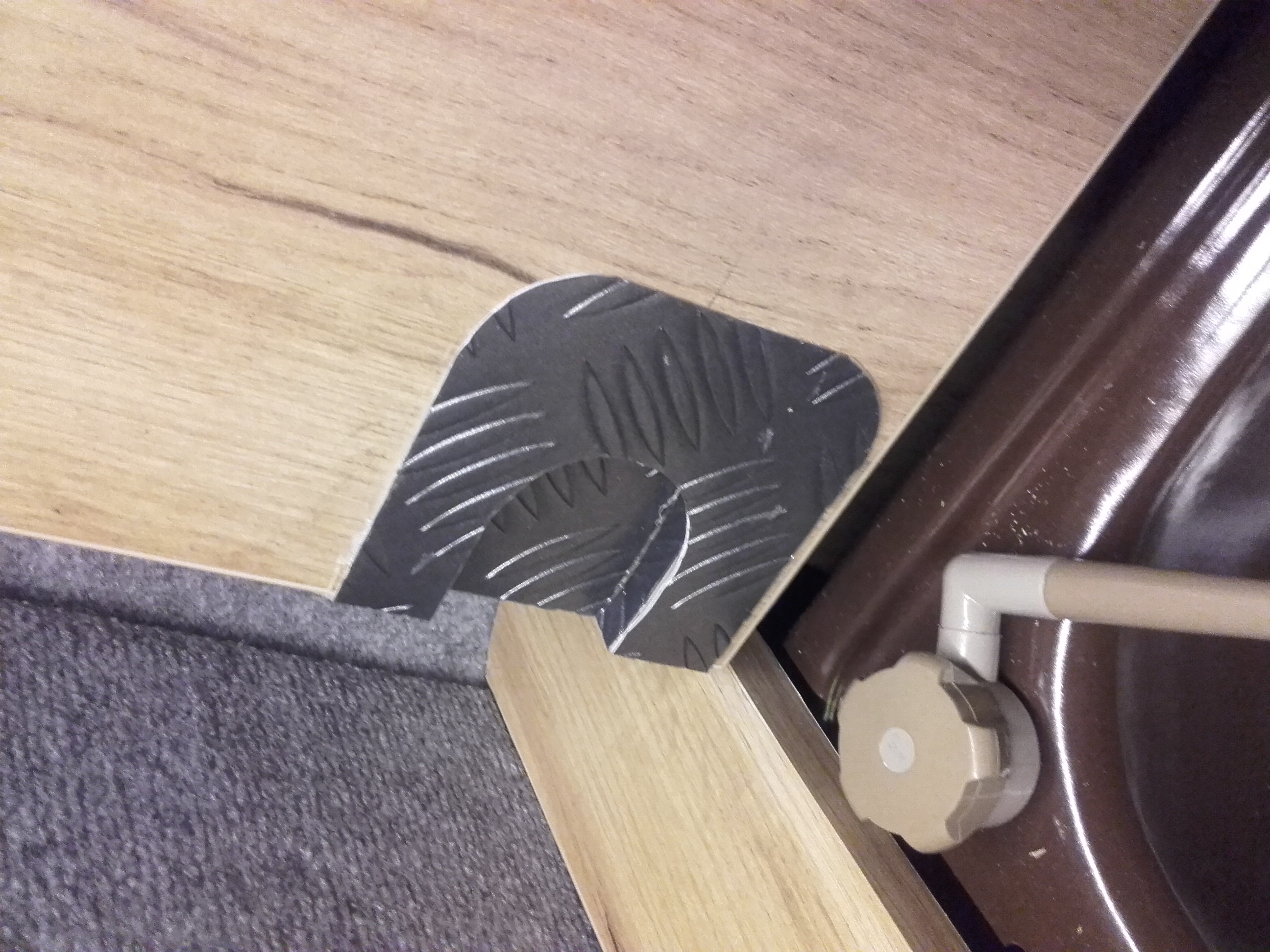 Tu jeszcze wspomniane podfrezowanie na baterię. Tylko dla cierpliwych...pierwszy otwór oszacowalismy prawie dobrze stolarnia się pomyliła i po poprawkach mieliśmy mega dziurę z która nie wiadomo było co zrobić. Padło na wklejanie kawałkami linoleum i wypełnieniu niepotrzebnej wolnej przestrzeni szpachlowką samochodową. Wyszło nawet zgrabnie...