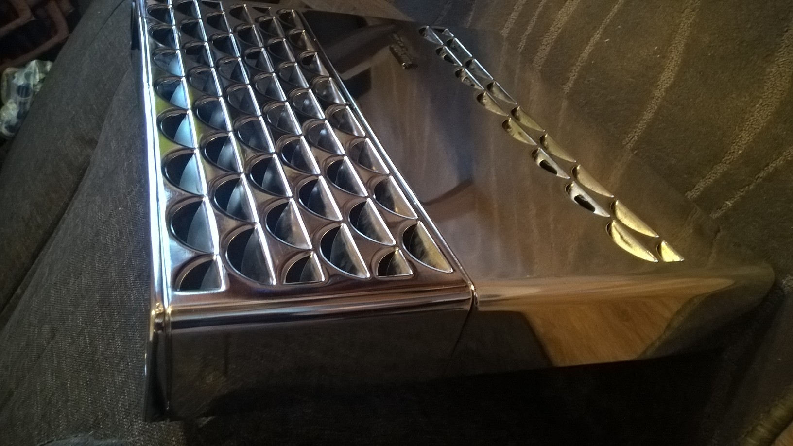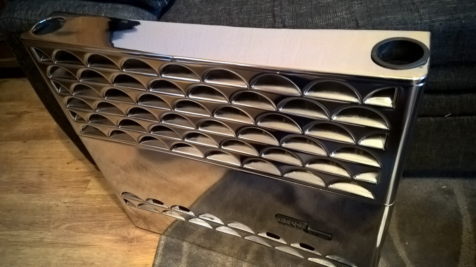 Podłączyłem więc zlew tzn. rurki dolotowo/wylotowe. Wylotowa trochę mi się zaginała pod odpływem, ale kawałek węża harmonijkowego załatwił sprawę i zrobił ładny wylot pod kątem 90 stopni. A najfajniejszą nagrodą było odebranie przedniej obudowy trumy od... "malowania" niklem ;-) Z racji, że nie mam dostępu do lakierni proszkowej, a mam znajomego galwanizera, postanowiłem "przetrzeć" nowy szlak i zaryzykowałem chromowanie. Wyszło bardzo ładnie, świeci się, jak nie powiem co.