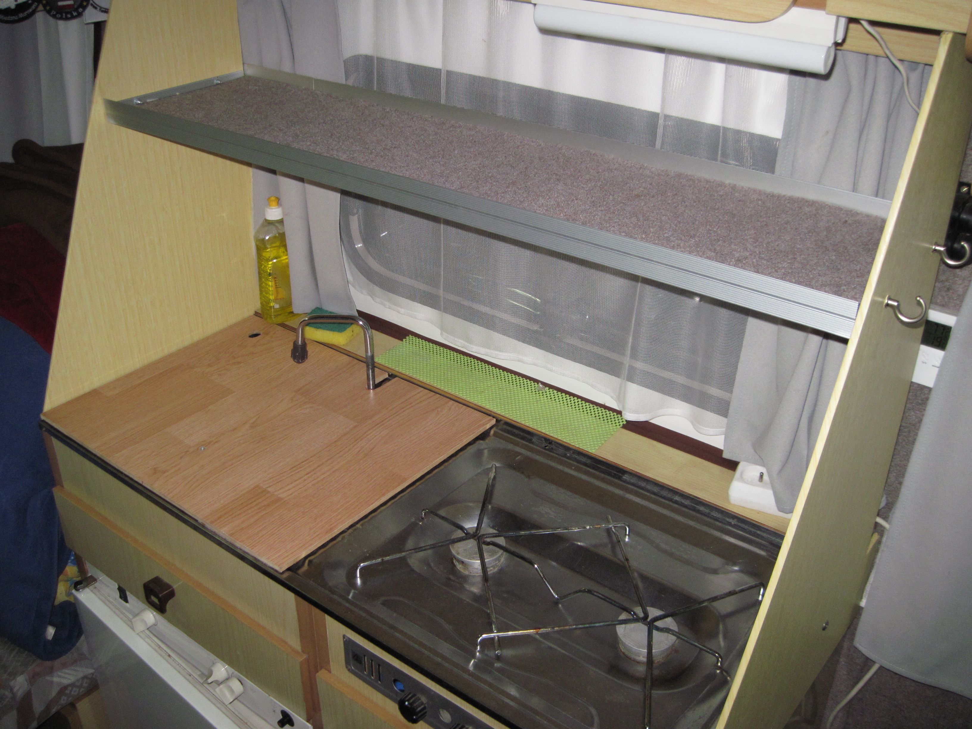 Podczas wojaży z enką w chłodniejsze dni, stwierdziliśmy że brakuje nam w niej miejsca do odłożenia kubka z kawą czy podstawowych produktów w czasie gdy łóżka są w pozycji do spania. Niby były otwierane blaty na kuchence, ale jeżeli chciało się skorzystać z kuchenki czy zlewozmywaka trzeba było wszystko przekładać z blatu na blat albo rozłożyć szeroko blaty co zajmowało miejsce nad łóżkami. Ponadto jakoś nie miałem nigdy pewności do wiszącej szafki nad aneksem kuchennym gdyż jak wiemy przodem wisi ona tylko na listwie zalaminowanej w ścianie i tyłem na listwie okiennej i tylnych meblach.