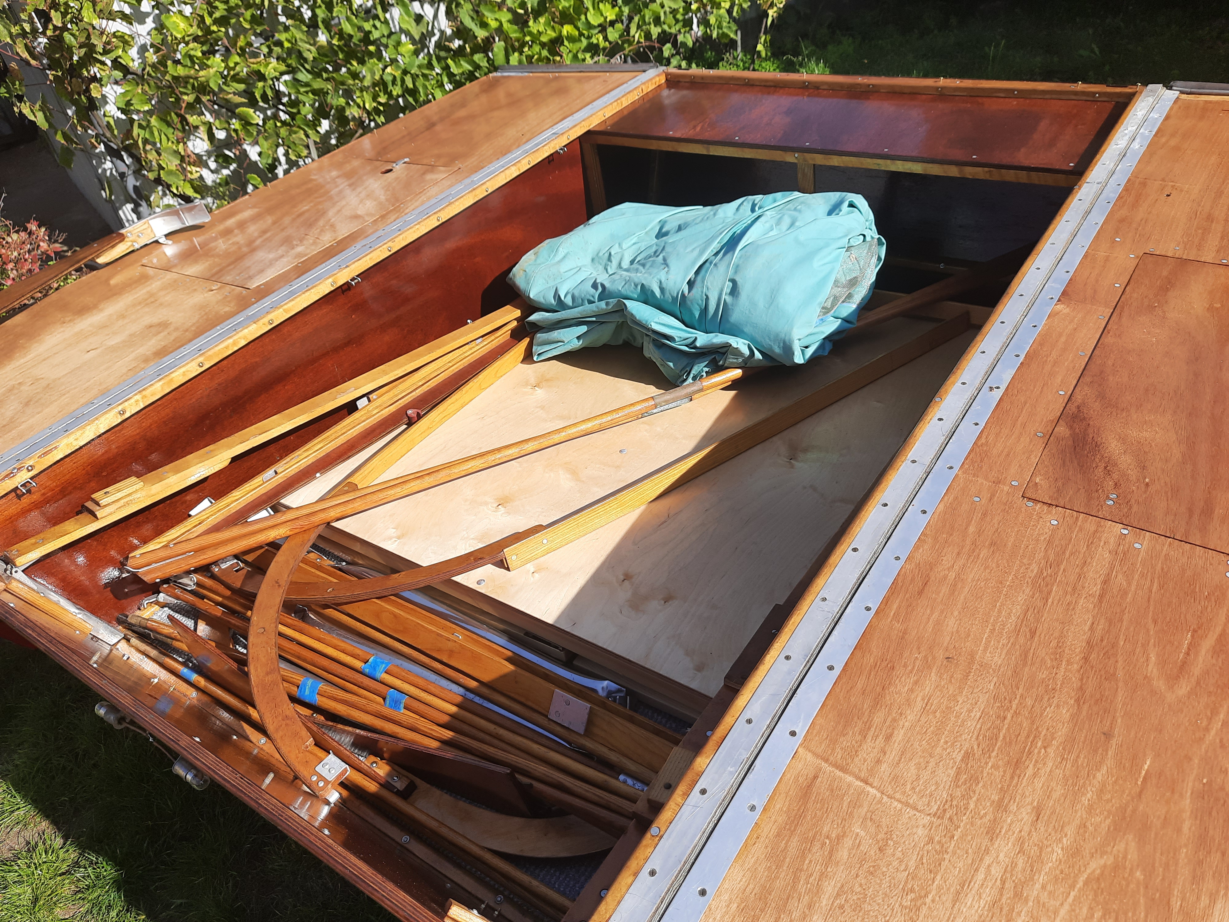 Dorobiłem dodatkowo sklejkę z nóżkami do wstawienia bezinwazyjnie pomiędzy "skrzydła". Taka dostawka da możliwość spania nam z Żoną w poprzek, obok siebie na wygodnym dmuchanym materacu o szerokości 120 cm.