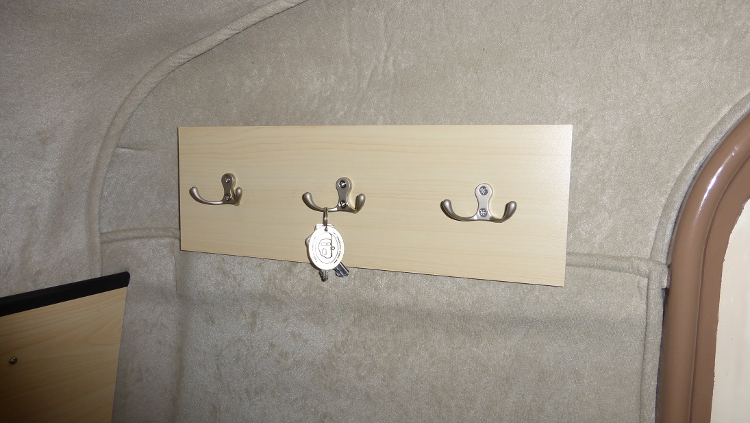 Dorobiłem też coś czego zawsze brakowało mi w przyczepie. Mowa o wieszakach na ścianie. Zrobiłem dwa zestawy wieszaków, jeden po lewej a drugi po prawej stronie przyczepy.