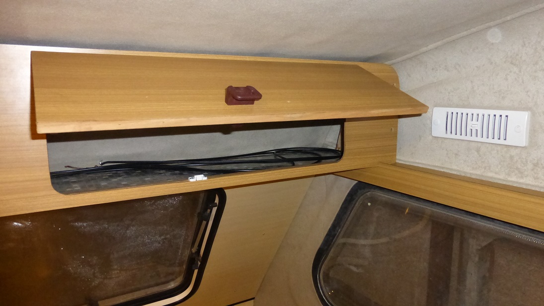Widok w stronę przodu. Górnej półki nie będzie, zrezygnowałem z niej żeby mieć więcej przestrzeni na głowę podczas korzystania z kibelka i ogólnie poruszania się w przyczepie. Będzie można wygodniej zajmować miejsca przy przednim stoliku. Likwidacja półki wymusiła przeniesienie lampy na sufit.