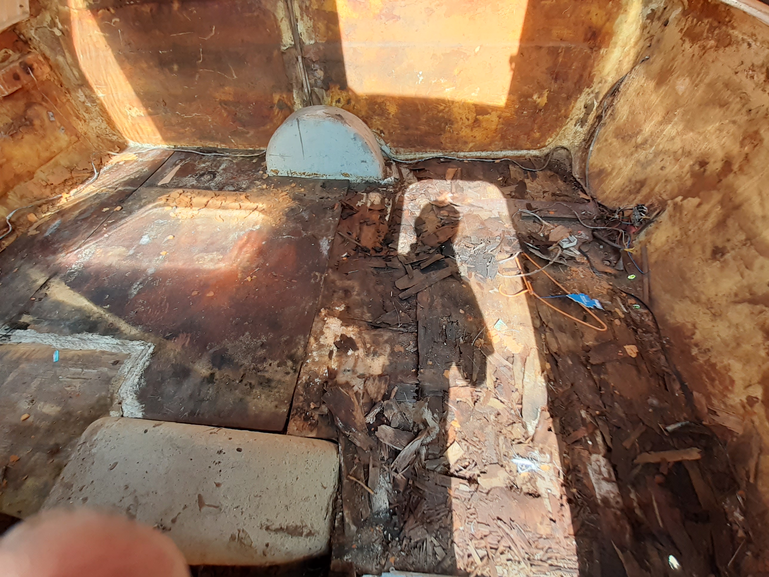 Jeśli chodzi o układ, to trochę wyszedł sam (przednia część mebli była nie do uratowania lub w ogóle ich nie było), a trochę był wynikiem przemyśleń. Szafę chciałem zostawić, łóżko/stół też, lewą podstawę łóżka postanowiłem odciąć na wysokości końca nadkola (równo z szafą) – w ten sposób cały przód przyczepy jest wolny – jest to miejsce do zabawy, ale nie tylko. Na śrubach mocujących budę zamontowałem solidne uszy do mocowania ładunku – będzie tu można zamocować moduł kuchenny (który mam nadzieję zrobić przez zimę), platformę do przewozu rowerów lub położyć na podłodze materac gdybyśmy jechali gdzieś we trójkę.